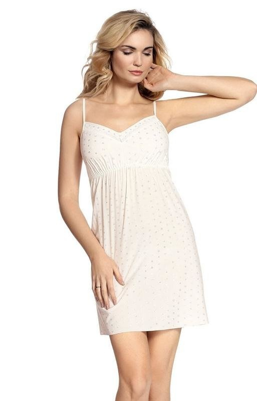Koszula nocna De Lafense 410 - Jeanne Wygodna koszulka damska, wykonana z bardzo delikatnego materiału. Ozdobiona błyszczącymi serduszkami. Skład: 97% poliester, 3% elastan.Koszula nocna De Lafense 410 - Jeanne to doskonały wybór dla każdej kobiety, która pragnie połączyć styl z komfortem podczas snu. Wykonana z wysokiej jakości poliestru, ta bielizna nocna oferuje przyjemne uczucie noszenia, które sprawi, że każde zaśnięcie będzie prawdziwą przyjemnością. Kolorystyka w odcieniach ecru z delikatnymi beżowymi akcentami wprowadza do sypialni niezwykle przyjemną i harmonijną atmosferę.