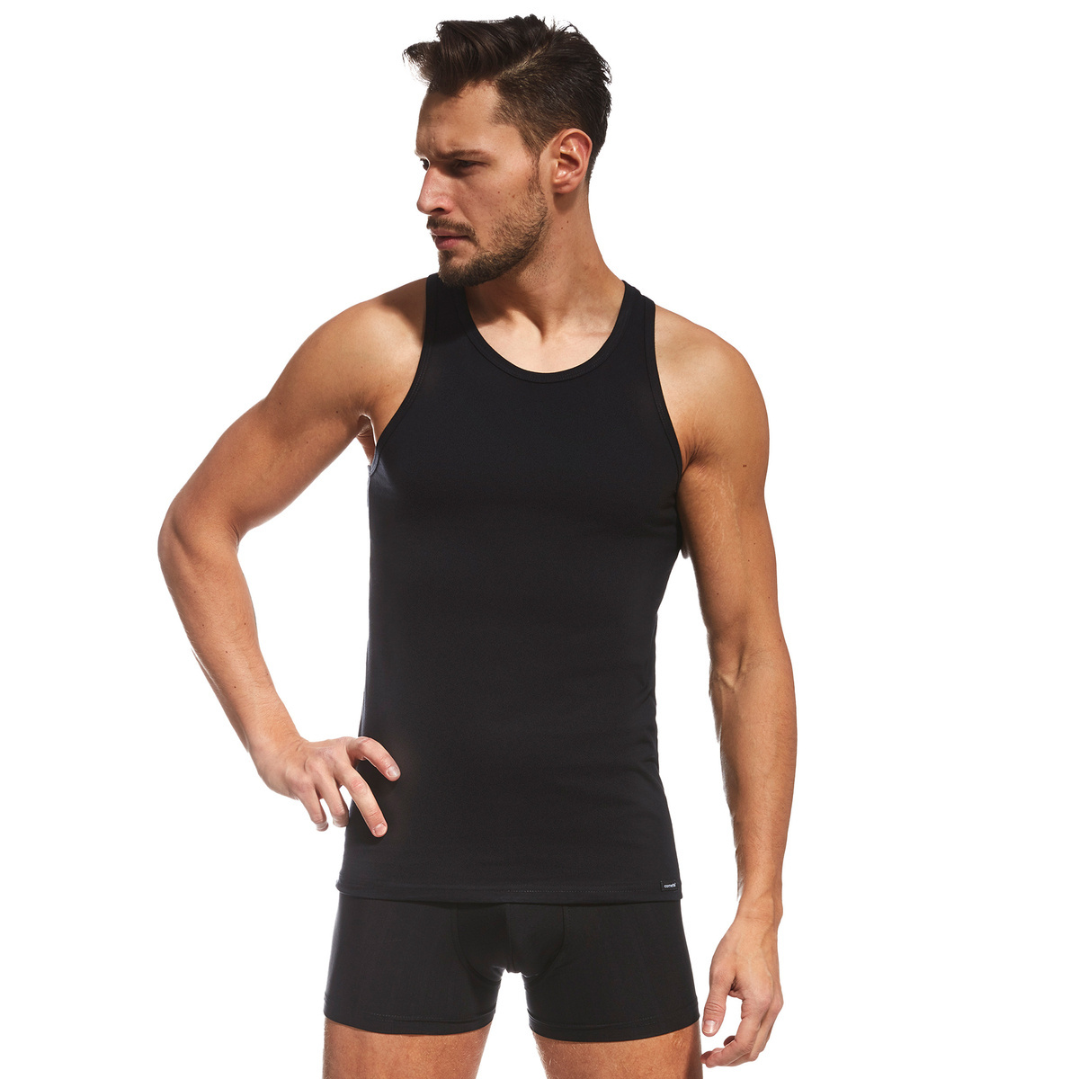 - Czarny klasyczny podkoszulek Cornette 205, na ramiączkach, uszyty z wysokiej jakości bawełny. Idealny jako bielizna dzienna jak i elegancki dodatek pod koszulę.