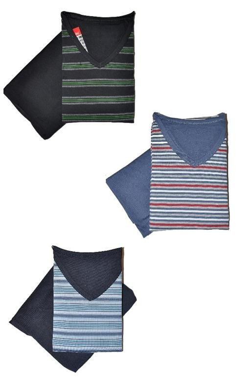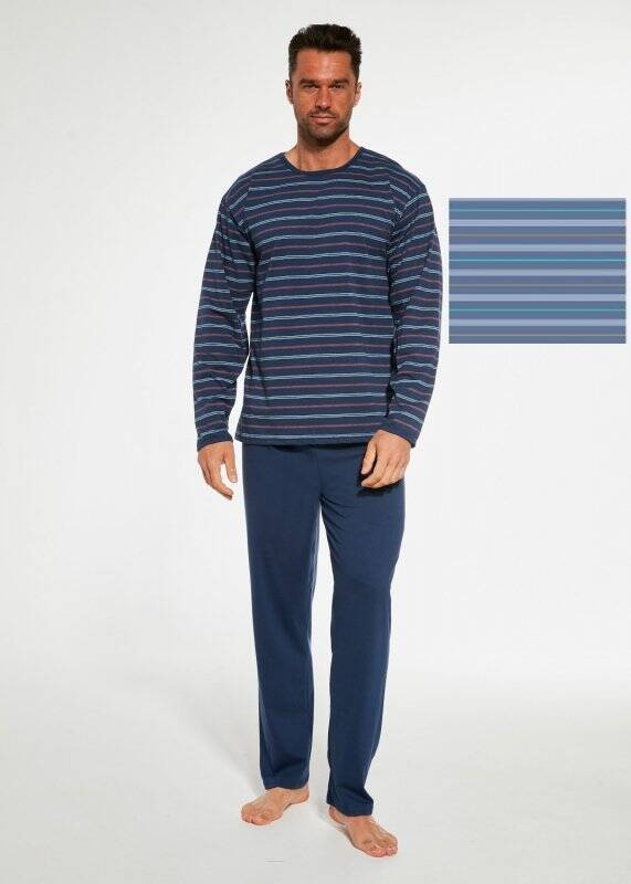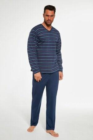 Piżama męska z długim rękawem, wykonana z wysokiej jakości bawełny. Bluzka w paski z dekoltem V, w serek. Spodnie gładkie, proste, jednolite nawiązujące kolorystycznie do całości piżamy. Model szyty w kilku odcieniach niebieskiego, wysyłany losowo. Skład: koszulka 90% bawełna, 10% poliester; spodnie 100% bawełna.Szczegółowe dane