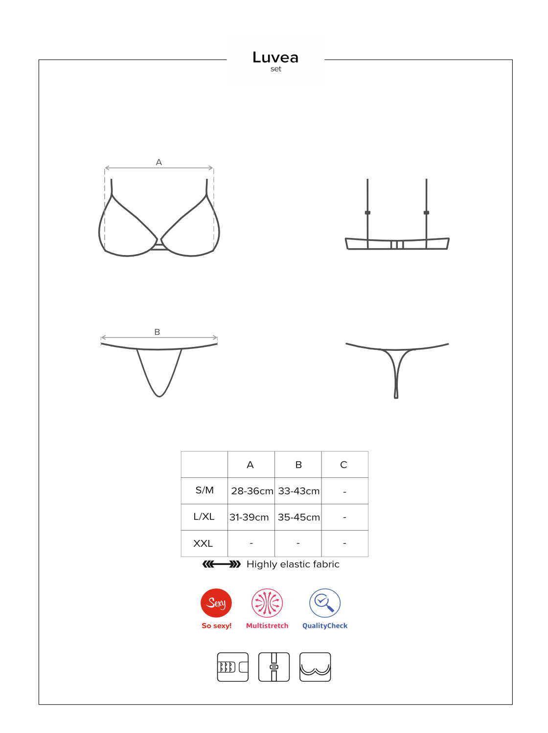 Seksowny koronkowy komplet damski biustonosz ze stringami Obsessive - Luvae. Koronkowy, delikatny biustonosz z fiszbinami, w zestawie ze ślicznie skrojonymi figami, podkreślającymi zalotnie pośladki. Bielizna idealna zarówno na romantyczny wieczór jak i dzień w pracy - cały czas możesz czuć się seksownie i ponętnie. Bardzo kobiecy komplet bielizny. Biustonosz o modnym kroju braletki z regulowanymi ramiączkami i zapięciem. Delikatne fiszbiny zbierają biust i seksownie eksponują dekolt. Przyjemny i elastyczny materiał Multistretch (90% poliamid, 10% elastanSzczegółowe dane