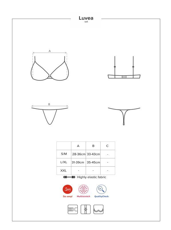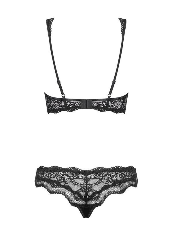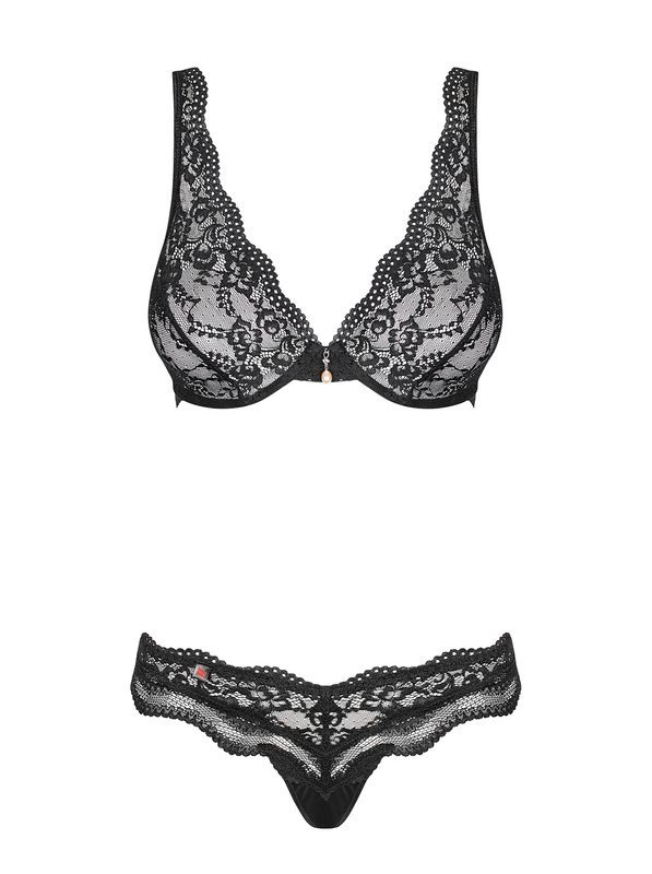 - Seksowny koronkowy komplet damski biustonosz ze stringami Obsessive - Luvae. Koronkowy, delikatny biustonosz z fiszbinami, w zestawie ze ślicznie skrojonymi figami, podkreślającymi zalotnie pośladki