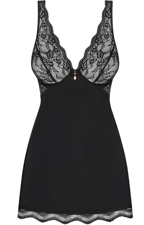 - Obsessive Luvae babydoll i stringi kolor: czarny. Bardzo seksowna, elegancka koszulka zdobiona na miskach i u dołu śliczna koronka. W zestawie z pasującymi stringami.