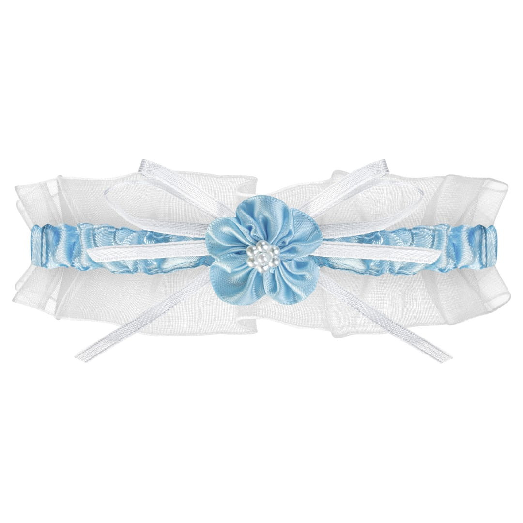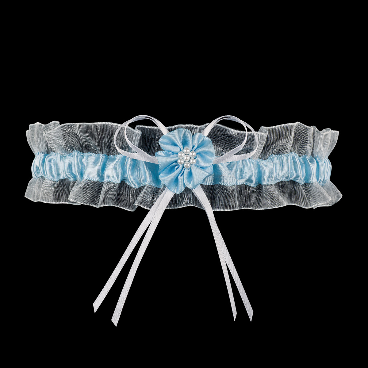 - Błękitno-biała ślubna podwiązka Julimex PW-33. Podwiązka szyta z satynowej taśmy, wykończonej na górze i na dole delikatnym tiulem, ozdobiona białą kokardką oraz błękitnym kwiatkiem z drobnymi perełkami w środku.