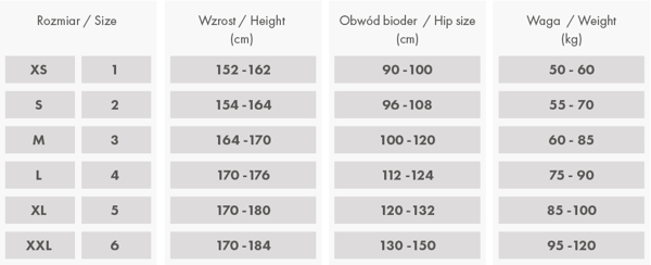 Rozmiar | Wzrost | Obwód bioder | Waga |