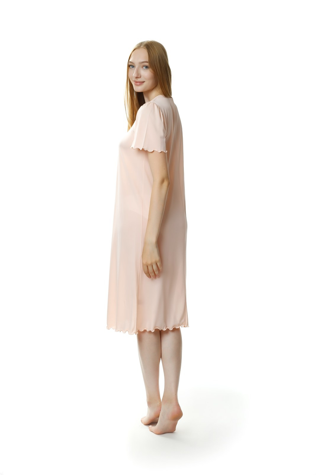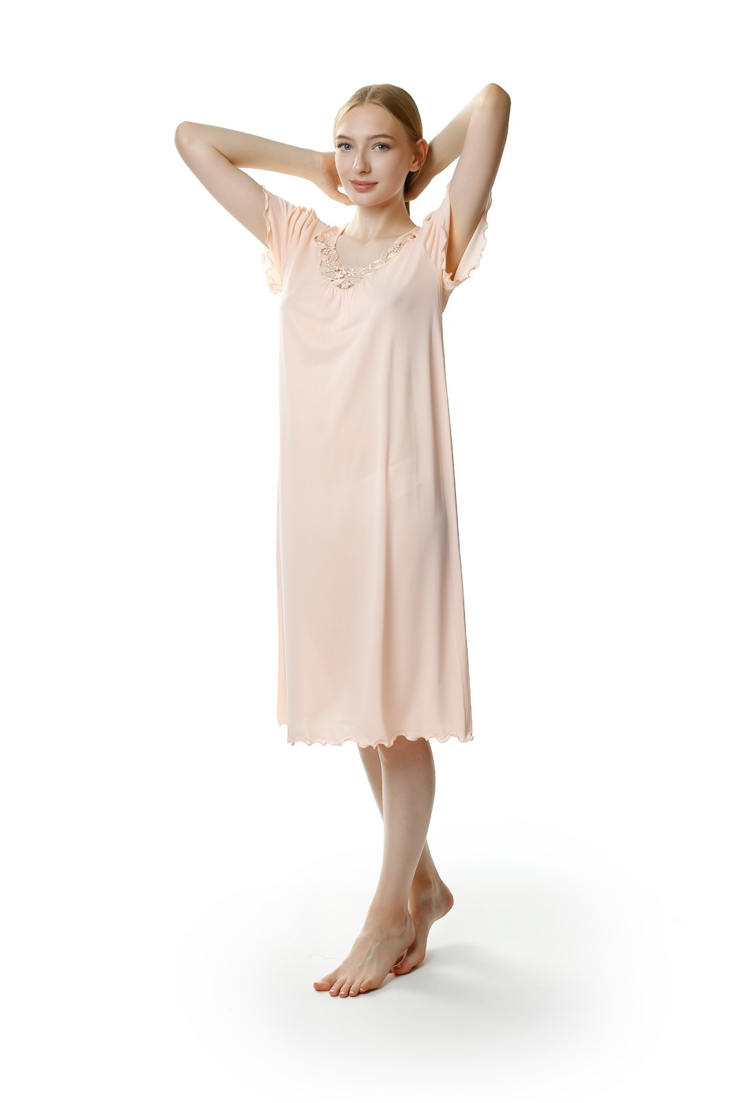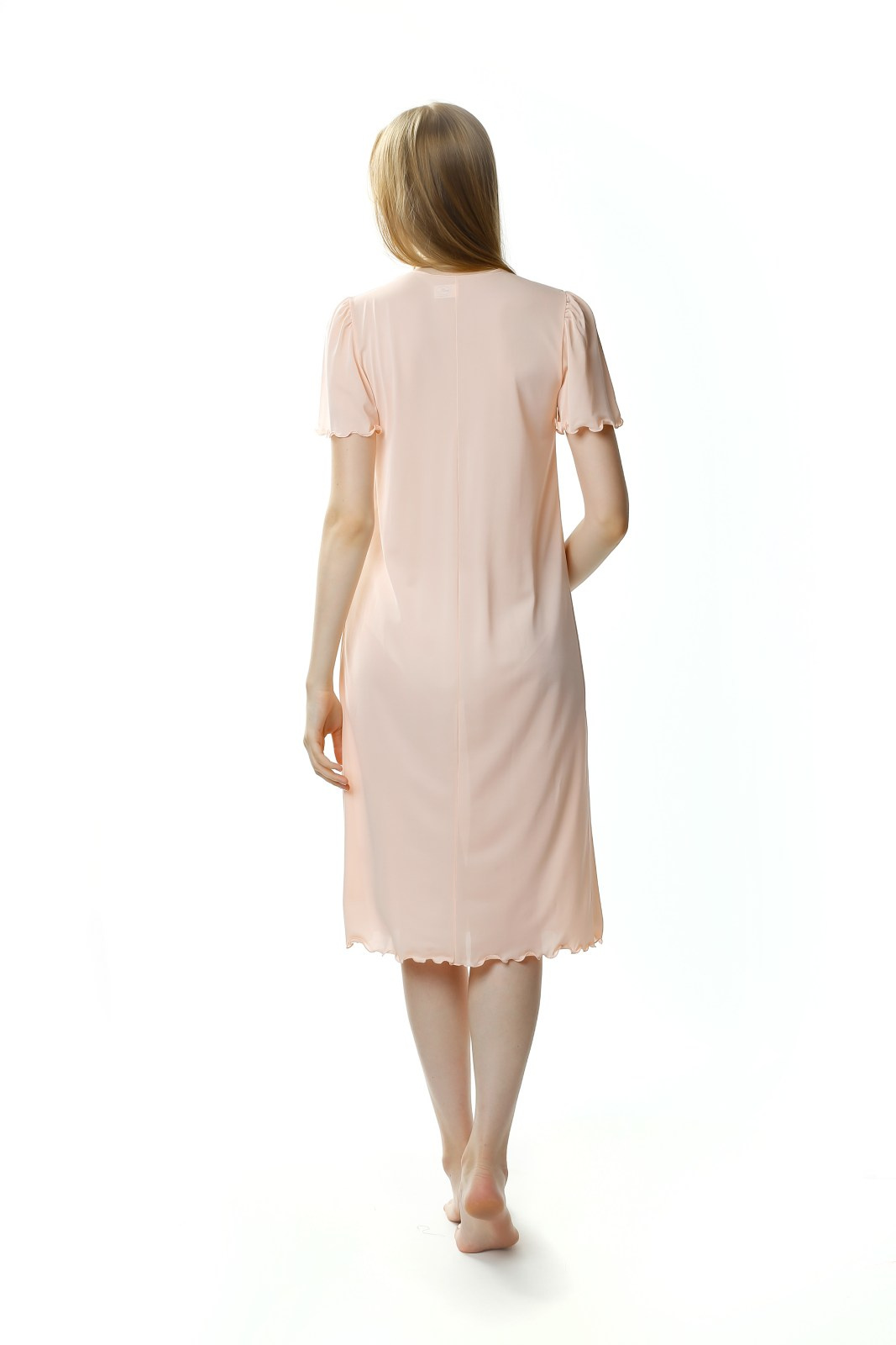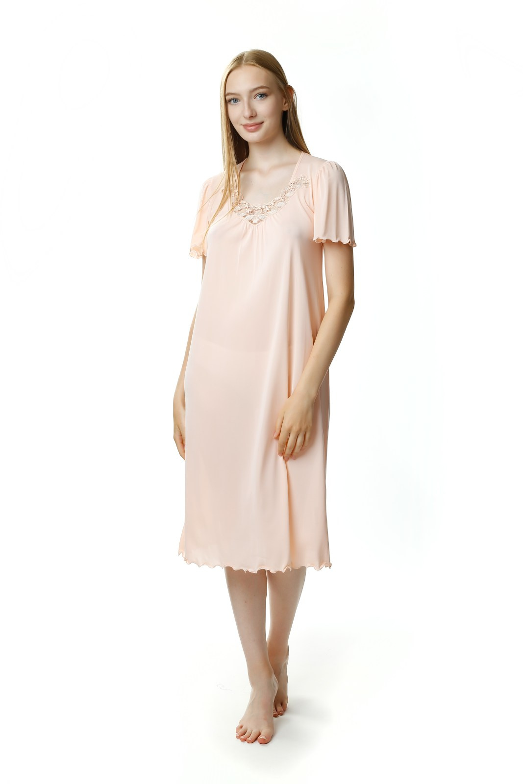 - Koszula nocna Mewa 4112, z krótkim rękawem, długa, za kolano. Motywem zdobniczym jest efektowna aplikacja przy dekolcie. Wykonana z jedwabiu wiskozowego Vistex- przewiewnego, antyalergicznego, higroskopijnego.