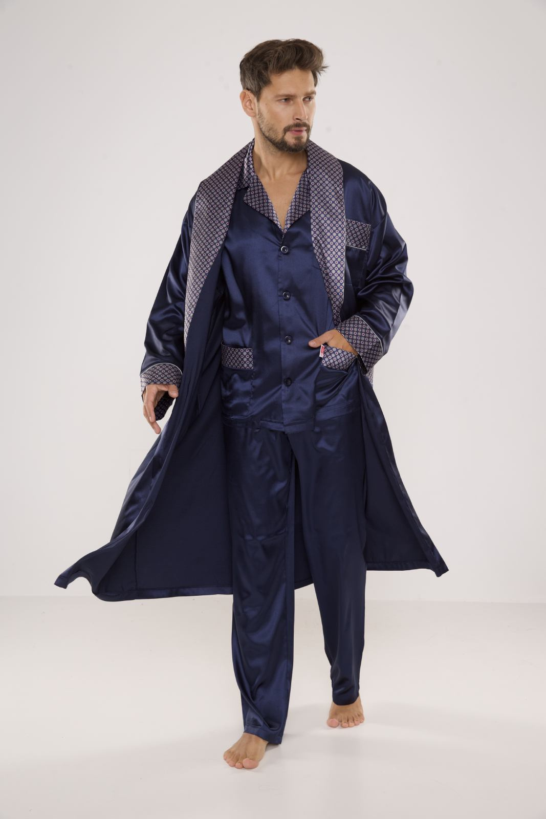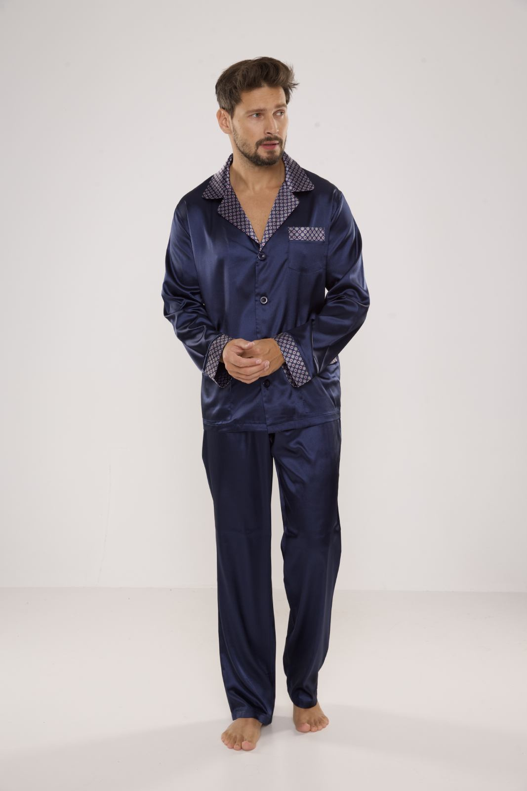 - Długa piżama męska De Lafense 939. Bardzo elegancka, satynowa męska piżama, rozpinana, z długim rękawem i długimi eleganckimi spodniami. Mankiety, kołnierz i kieszenie wykończone dodatkowo wzorzystą satyną co podkreśla elegancję i charakter.