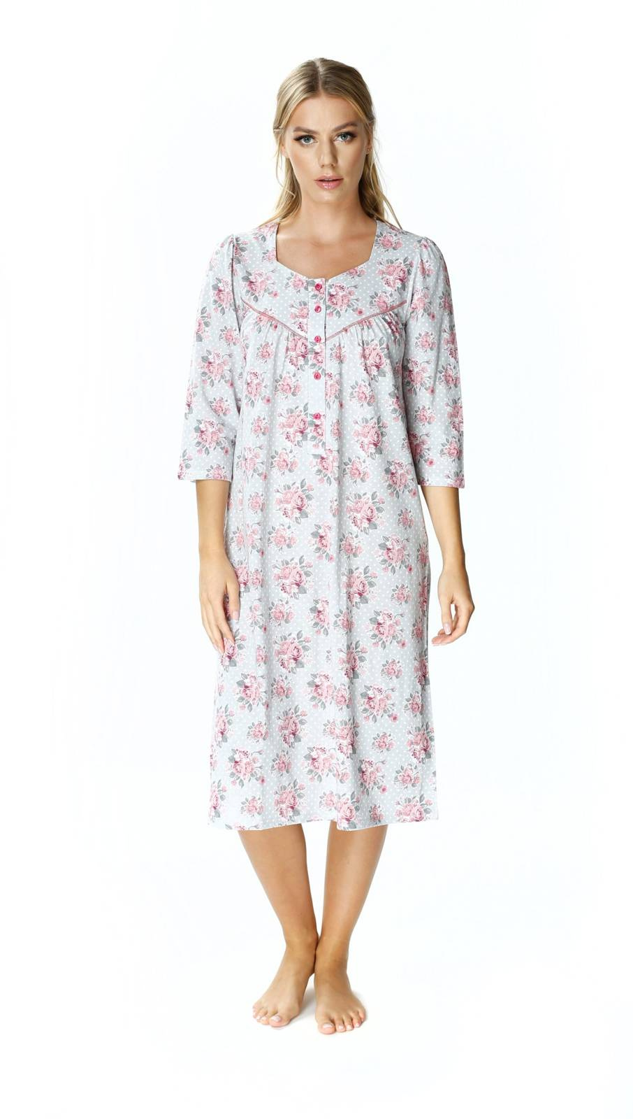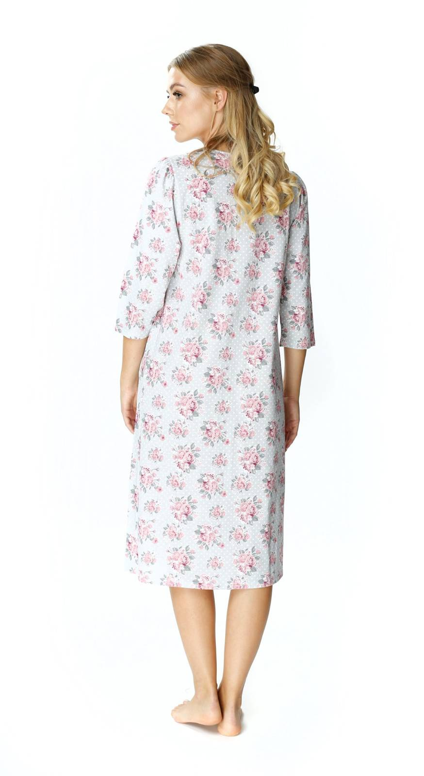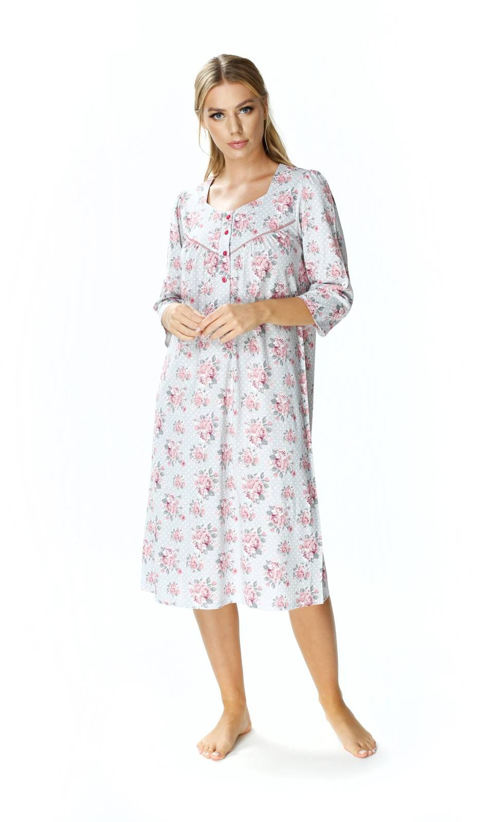 Model 6306 wyróżnia się długimi rękawami o długości 3/4, co zapewnia ciepło i wygodę podczas chłodniejszych nocy. Okrągły dekolt nadaje mu elegancki wygląd, a jednocześnie gwarantuje swobodę ruchów. Długość koszuli sprawia, że idealnie sprawdzi się jako koszula nocna damska długa, zapewniając pełne okrycie ciała oraz komfort podczas snu. Dzięki swojej uniwersalności, model ten można nosić również jako element stylizacji domowej, w połączeniu z ulubionymi kapciami czy szlafrokiem.