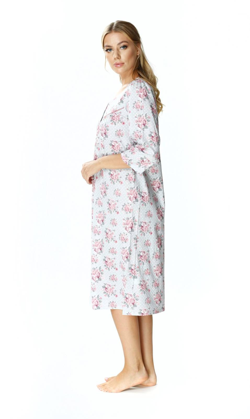 Koszula nocna Ingrid ma klasyczny i prosty krój, dekolt różową lamówką oraz rękawy o długości ¾. Koszula uszyta jest w 100% z bawełny. Bawełniane koszule są delikatne i miękkie w dotyku, przepuszczają powietrze, pozwalają skórze oddychać. Bawełna jest materiałem trwałym i odpornym na uszkodzenia mechaniczne. Bardzo ładny ponadczasowy i kobiecy print w kwiaty oraz kropeczki.Długa koszula nocna Mewa 6306 Ingrid to doskonały wybór dla wszystkich kobiet ceniących sobie komfort i elegancję w czasie snu. Wykonana z wysokiej jakości bawełny, zapewnia przyjemne uczucie na skórze oraz odpowiednią wentylację, co jest szczególnie ważne podczas letnich nocy. Produkt dostępny jest w pięknym, różowym kolorze, który dodaje mu subtelności i kobiecości. Koszula nocna Mewa 6306 to model, który sprawdzi się zarówno dla kobiet, które oczekują dziecka, jak i dla tych, które szukają koszuli nocnej damskiej w dużych rozmiarach.