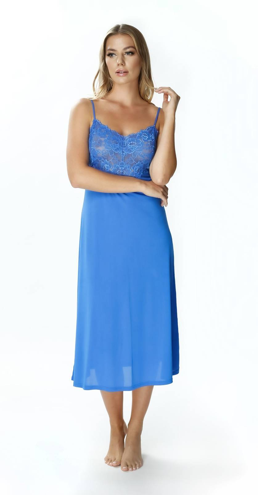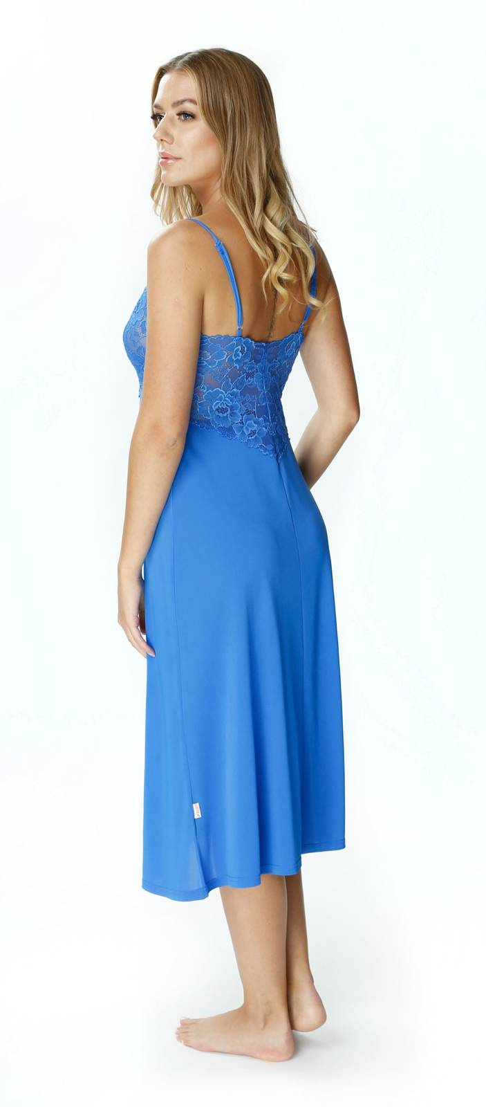 Jedwabna koszulka nocna Mewa 6125 Flamenco. Przepiękna koszula na cieniutkich ramiączkach z bogato zdobionym koronką dekoltem. Koszulka posiada cieniutkie regulowane ramiączka, dekolt w szpic i długość za kolano. Dzięki niezastąpionym właściwościom jedwabiu wiskozowego koszula nocna Flamenco jest: · wygodna · oddychająca · przewiewna · termoaktywna · przyjemna w dotyku · nie uczula i nie podrażnia skóry · nie przykleja się do ciała · nie elektryzuje sięJedwabna koszulka nocna zdobiona koronką Mewa 6125 Flamenco to idealna propozycja dla kobiet ceniących sobie elegancję i wygodę podczas snu. Wykonana z jedwabiu wiskozowego Vistex, ten wyjątkowy model w kolorze szafirowym zapewnia niezwykły komfort noszenia oraz przyjemne wrażenia dotykowe. Koszulka posiada okrągły dekolt oraz długie ramiączka, co sprawia, że perfekcyjnie dopasowuje się do sylwetki. Dziewczęce zdobienia z koronki dodają całości subtelności i klasy, dzięki czemu jest to doskonała koszula nocna dla puszystych pań oraz miłośniczek sekretnych przyjemności. Produkt dostępny jest w wielu rozmiarach, co sprawia, że każda kobieta znajdzie idealne dopasowanie.