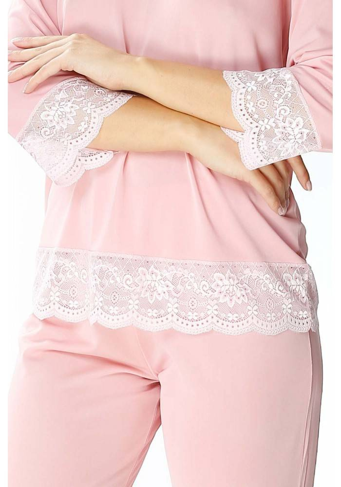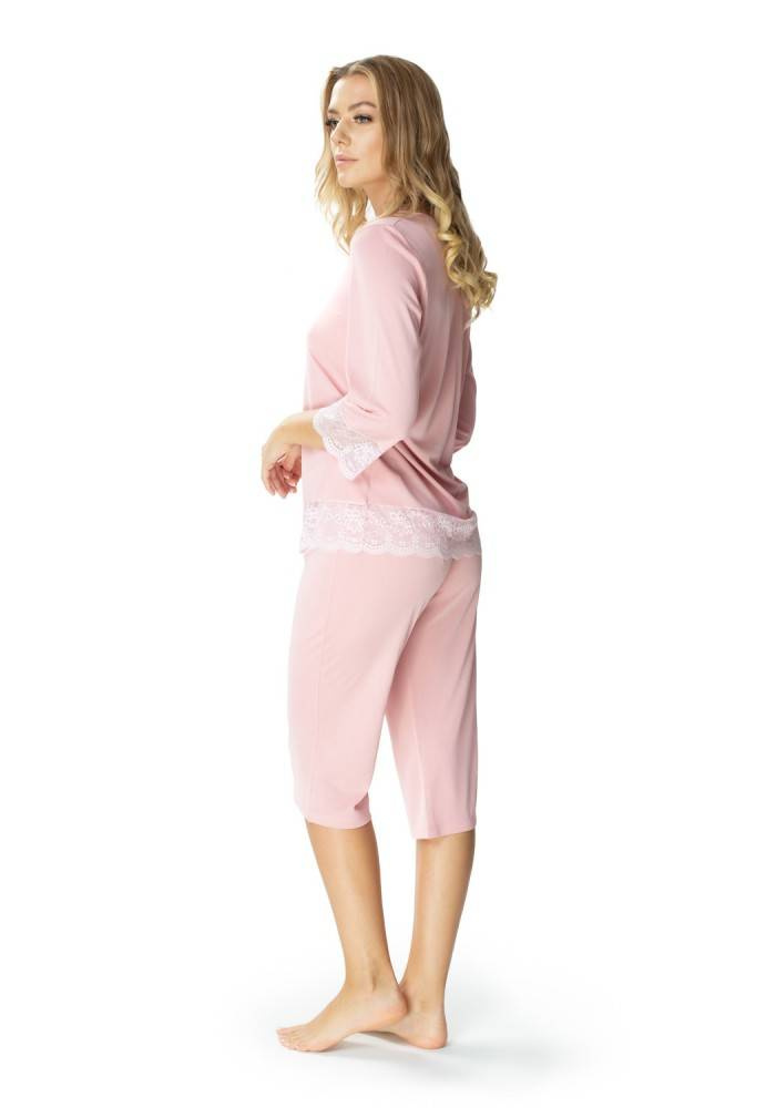 - Dwuczęściowa jedwabna piżama damska Mewa 6355 Peonia. Piżama składa się z koszulki z rękawem długości 3/4 i okrągłym dekoltem. Zarówno rękawy jak i dół koszulki zakończone koronką. W komplecie gładkie spodnie o długości 3/4.