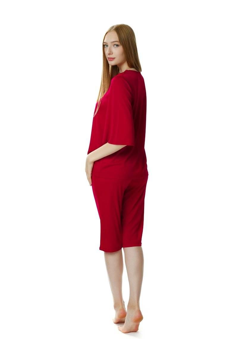 Dwuczęściowa jedwabna piżama damska Mewa 6377 Dagmara. Bluzka piżamy luźna z rękawem 3/4, dekoltem w szpic i koronką nad dekoltem. W komplecie gładkie spodnie o długości 3/4. Piżama Dagmara została wykonana z jedwabiu wiskozowego, który jest materiałem ekologicznym, higroskopijnym, oddychającym, doskonale przepuszczającym powietrze. Jedwab wiskozowy ceniony jest również za wysoką wytrzymałość i odporność na uszkodzenia mechaniczne. Ponadto jedwab wiskozowy wykazuje również właściwości antyalergiczne i antybakteryjne, dlatego nasze piżamy sprawdzą się również dla osób o wrażliwej i delikatnej skórze.Dwuczęściowa jedwabna piżama damska Mewa 6377 Dagmara to idealny wybór dla każdej kobiety, która ceni sobie wygodę i elegancję w nocy. Ta piżama damska jednokolorowa w eleganckim burgundowym kolorze doskonale sprawdzi się zarówno w chłodniejsze noce, jak i podczas romantycznych wieczorów. Wykonana z wysokiej jakości jedwabnego wiskozy Vistex, piżama oferuje wyjątkowy komfort noszenia oraz doskonałą oddychalność. Zmysłowy dekolt w kształcie szpica doskonale podkreśla kobiecą linię szyi, natomiast 3/4 rękawy dodają całości subtelności. Model ten dostępny jest w dużych rozmiarach, co sprawia, że każda kobieta może poczuć się w nim pięknie i komfortowo.