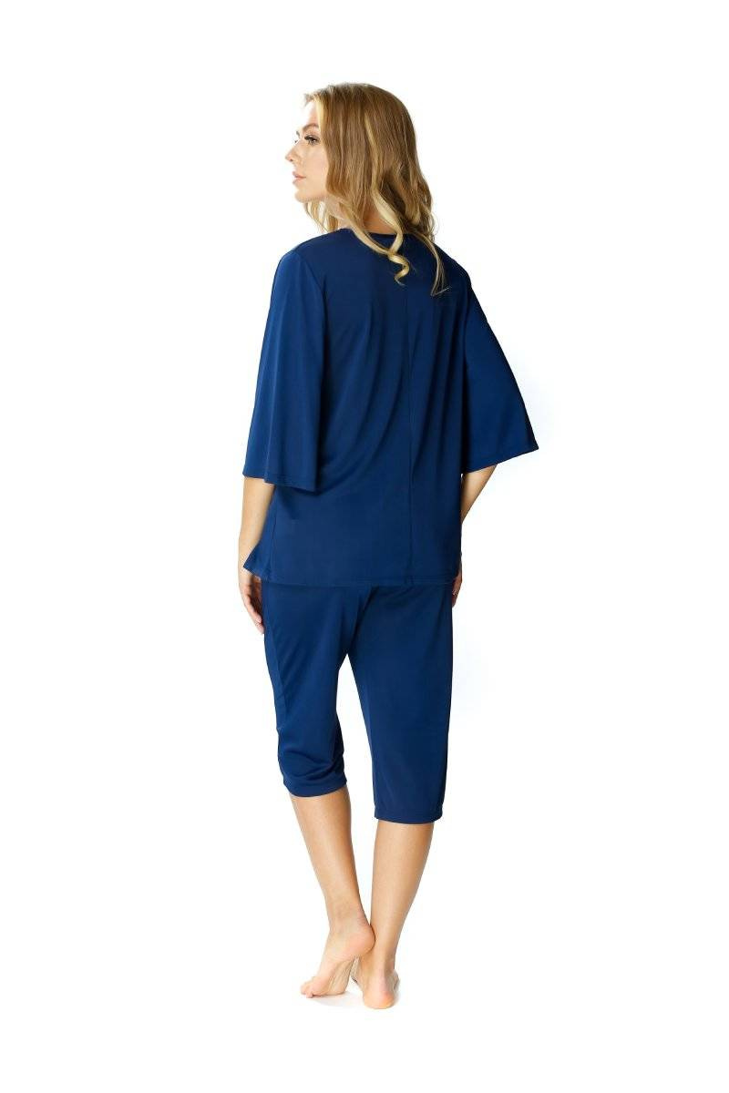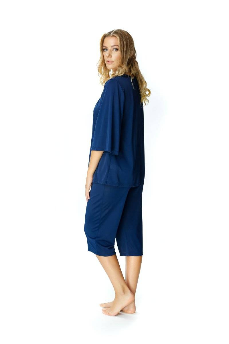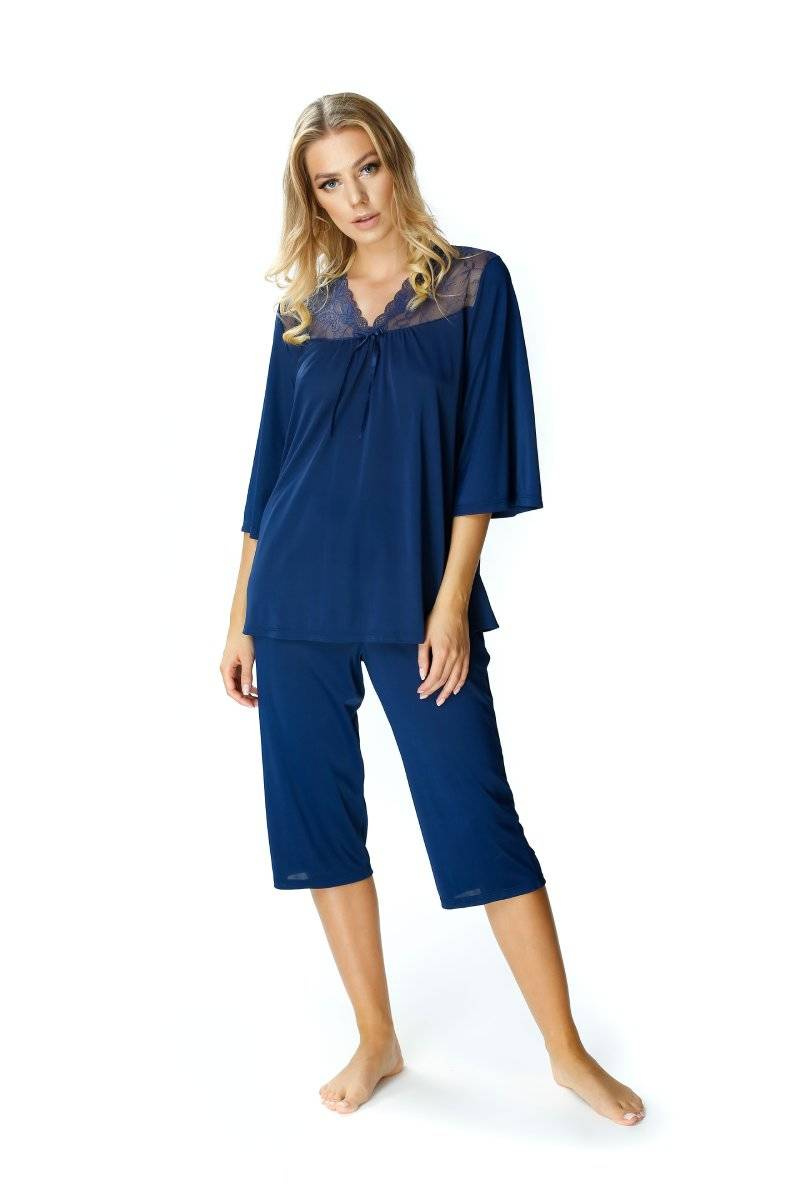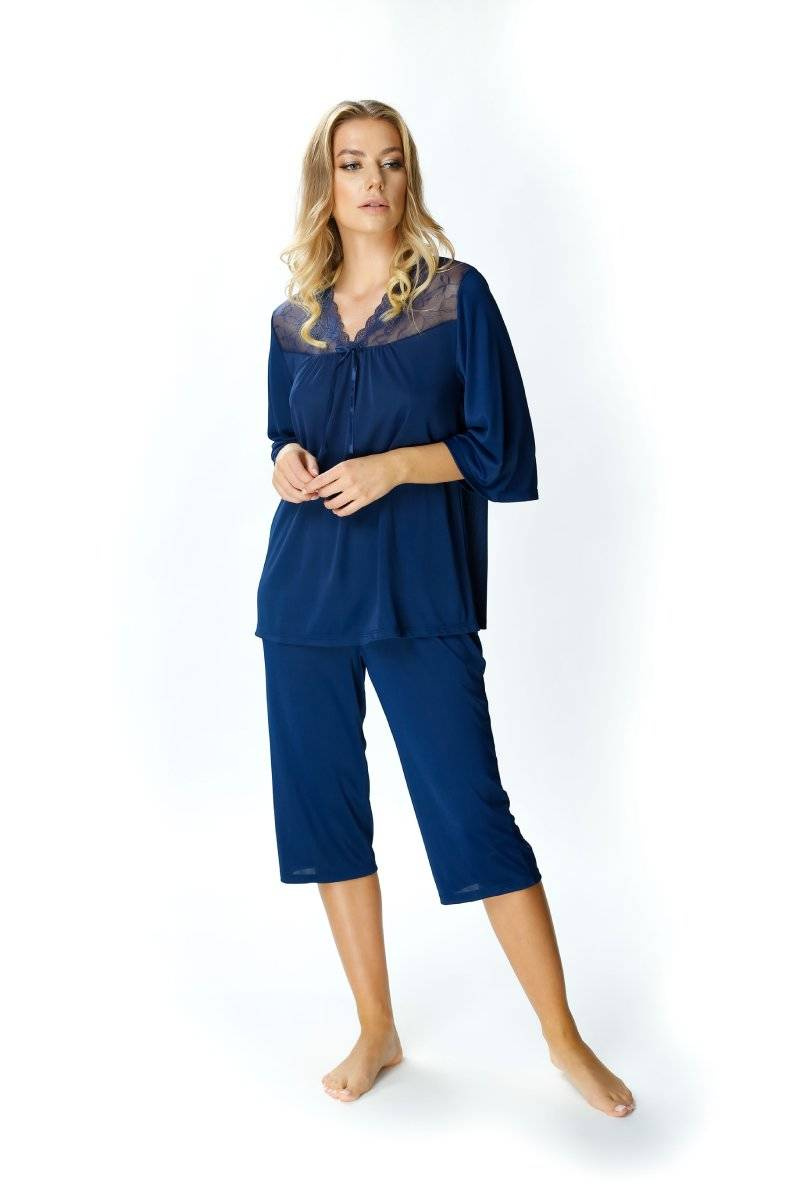 - Dwuczęściowa jedwabna piżama damska Mewa 6377 Dagmara. Bluzka piżamy luźna z rękawem 3/4, dekoltem w szpic i koronką nad dekoltem. W komplecie gładkie spodnie o długości 3/4.
