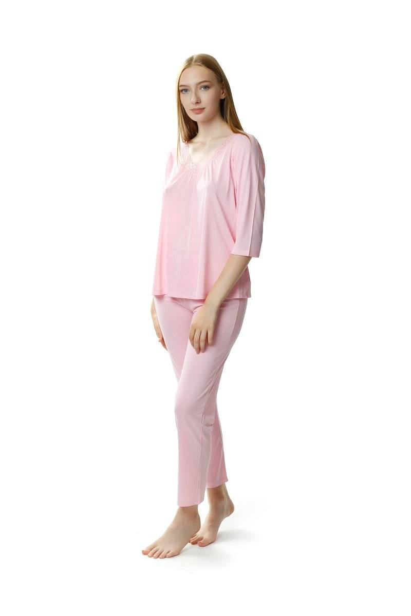 - Dwuczęściowa piżama damska Mewa 6202 Vivien. Posiada bluzkę z rękawem o długości 3/4 i ozdobną koronkową wstawką na dekolcie oraz długie klasyczne spodnie. Szyta z jedwabiu wiskozowego, który jest miękki, delikatny, nie uczula i przepuszcza powietrze.