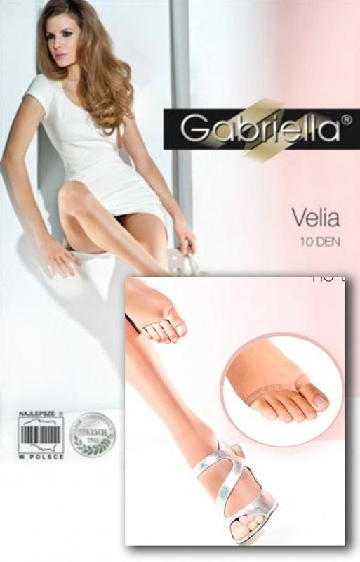 - Rajstopy Gabriella Velia - bezpalcowe cienkie rajstopy z lycry, z odciętą częścią palcową. Bez wydzielonej części majteczkowej, z bawełnianym klinem, szyte płaskim szwem.Velia 10 den to idealne letnie rajstopy do odkrytego obuwia.