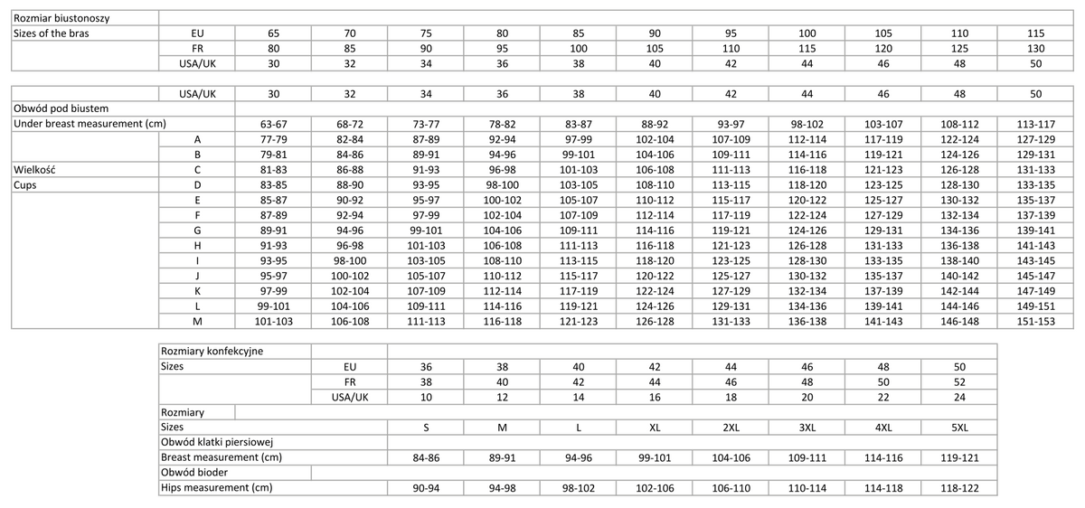 Rozmiar | Obwód pod biustem [cm] | Obwód w biuście [cm] |