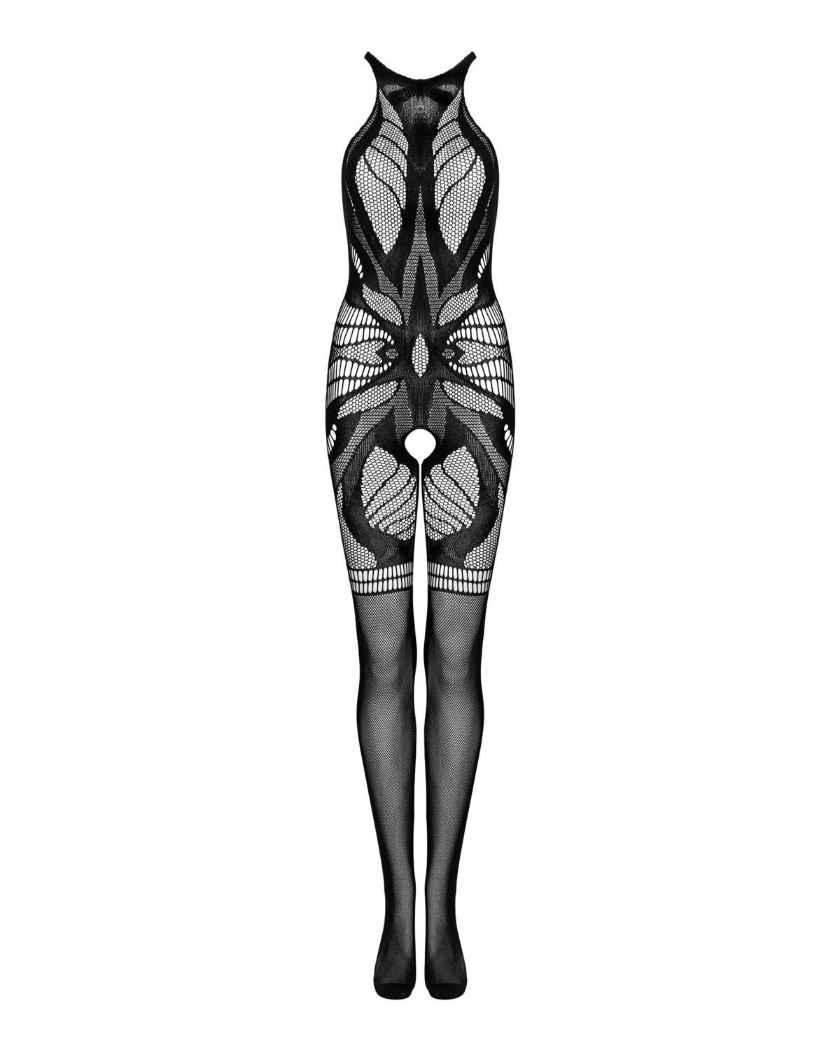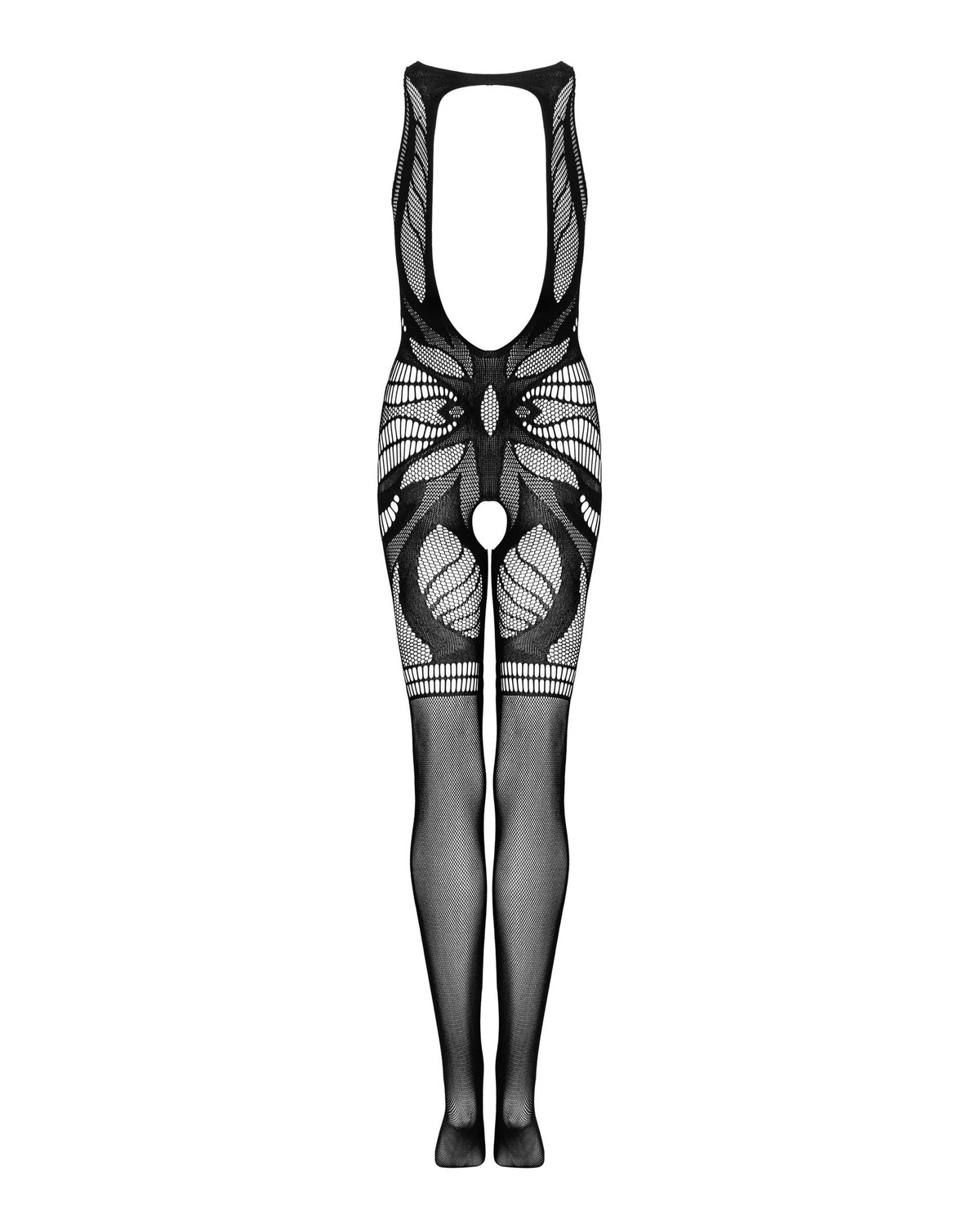 Obsessive G331 - kuszący czarny bodystocking szyty z elastycznej siateczki dopasowującej się do kobiecej sylwetki. Body posiada okrągły dekolt, skrojony blisko szyi i mocniejsze wycięcie eksponujące ramiona. Dodatkowo model posiada wycięcie z tyłu eksponujące plecy i otwarty, kuszący krok. Skład: 90% nylon, 10% elastan.Szczegółowe dane