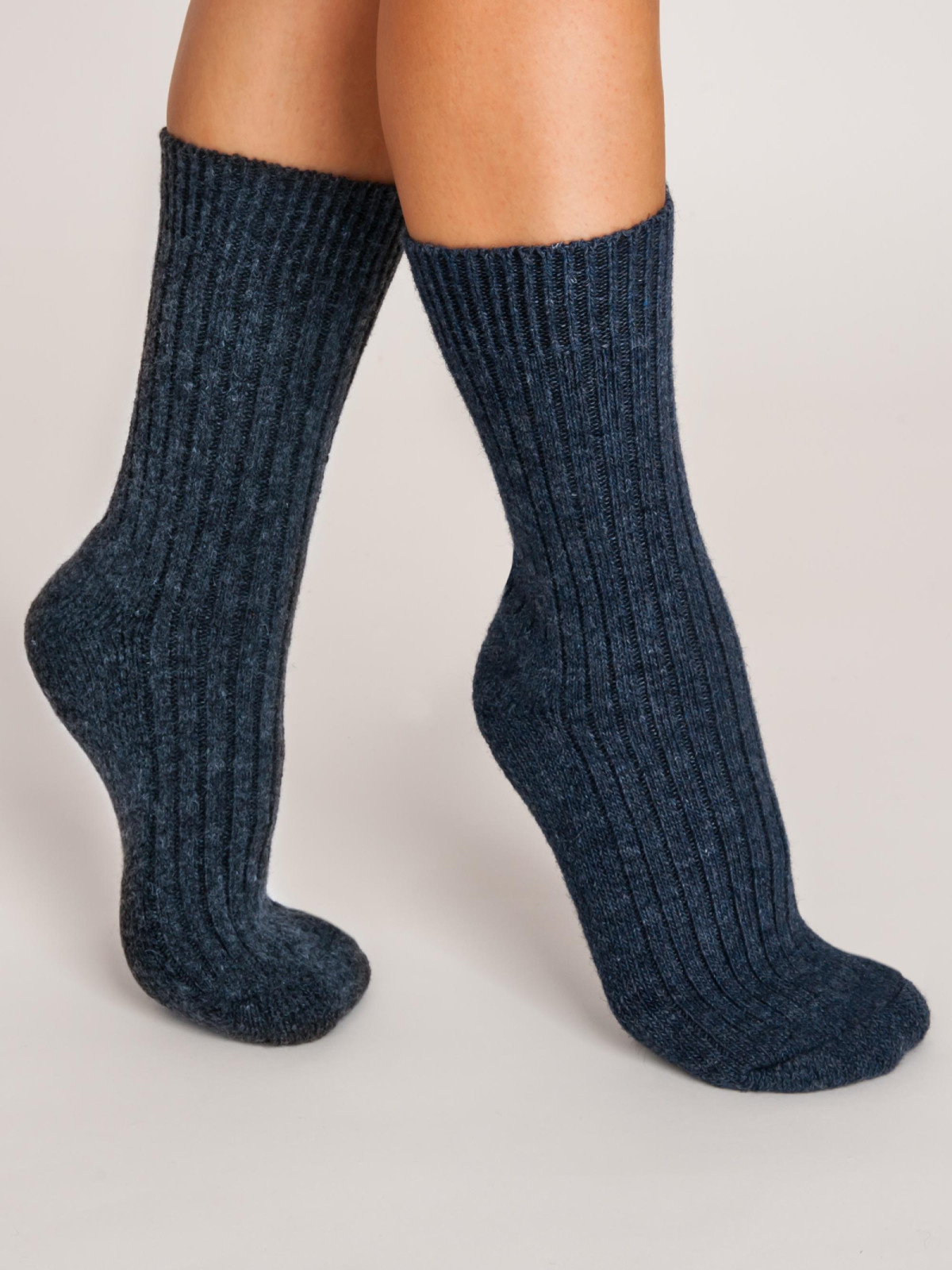 Uniwersalne ciepłe skarpety z wełną dla kobiet. Wygodne, jednokolorowe skarpety w niebieskim, jeansowym kolorze, z ozdobnymi paskami. Skład: 30% wełna, 60% akryl, 5% poliamid, 5% elastan