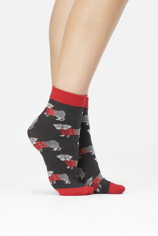 - Skarpetki w kolorze szary melanż ozdobione wzorem w motywem świątecznym.