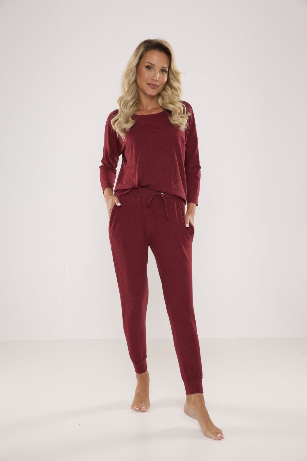 De Lafense - 555 / Paula. Komplet damski wykonany z wysokiej jakości wiskozy. Modny homewear, swobodny dresik, albo wygodna piżama- nosisz jak chcesz i lubisz. Bluzka z rękawem o długości 7/8 o luźnym i wygodnym fasonie. Do kompletu długie spodnie z kieszeniami. Pas z szeroką gumą, wygodna gumą obszytą wiskozą. Nogawki zakończone ściągaczem. Skład: 80% wiskoza, 15% poliester, 5% elastan.Odkryj elegancję i komfort w każdej nocy z bordowym kompletem damskim De Lafense 555 Paula.