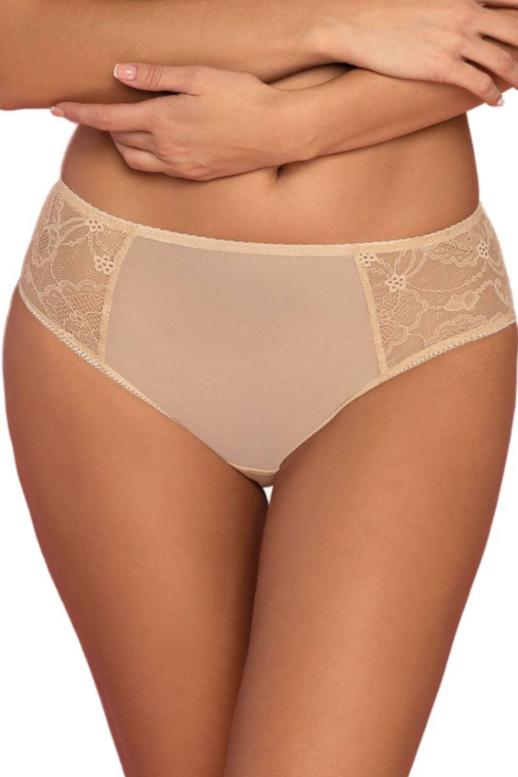 - Klasyczne figi w kolorze beżowym. Boki wykończone elegancką koronką.