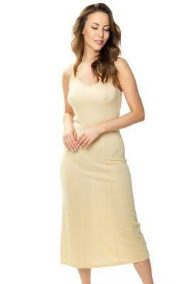Długa halka damska na szerokich ramiączkach, z jedwabiu Vistex, z niestandardową długością za kolano, dzięki czemu może służyć nie tylko jako halka pod sukienkę, ale również jako koszula nocna. Halka w szerokiej rozmiarówce, także w większych rozmiarach więc jej atutem są szerokie ramiączka, które zapobiegają wbijaniu się w skórę przy większych rozmiarach. Uszyta z naturalnego materiału, nie uczulającego i oddychającego, nie przykleja się do ciała i nie elektryzuje i można ją nosić pod obcisłe lub luźne spódniczki i sukienki . Jedwab wiskozowy Vistex to specjalny, opatentowany materiał, termoaktywny i przewiewny, odprowadzający wilgoć na zewnątrz, komfortowy dla alergików. Świetnie sprawdzi się jako bielizna nocna. Cięcia francuskie pozwalają na idealne dopasowanie halki do krągłości naszego ciała. Halka posiada także ładnie wyprofilowany dekolt podkreślający kobiece atuty. Wykonana z jedwabiu wiskozowego 72% wiskoza, 28% poliamid.Długa beżowa jedwabna halka Mewa Clarysa 6552 to idealny wybór dla kobiet, które cenią sobie elegancję i komfort. Znana marka Mewa zaprezentowała model 86552-CLARYSA-BEŻ, który doskonale sprawdzi się jako halka pod sukienkę, półhalka pod sukienkę lub jako element nocnej garderoby. Wykonana z wysokiej jakości jedwabiu wiskozowego Vistex, halka jest nie tylko przyjemna w dotyku, ale także zapewnia swobodę ruchów, dzięki czemu każda chwila w niej spędzona będzie wyjątkowa.