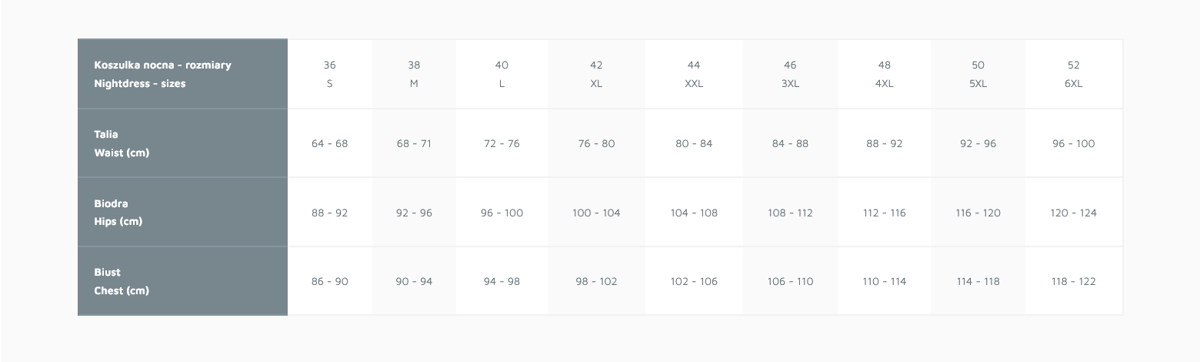 Rozmiar | Rozmiar konfekcyjny | Obwód w talii [cm] | Obwód w biodrach [cm] | Obwód w biuście [cm] |