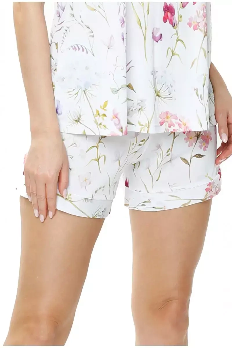 Krótkie spodenki Flores z pięknego wzorowanego jedwabiu Vistex w subtelne, nasycone kolorami kwiaty. Spodenki mają wszytą w pasie wygodną, rozciągliwą gumkę. Można je zestawić z topem lub koszulką z kolekcji Flores , tworząc np dwuczęściową piżamkę. Taka kolorowa piżama jest niezwykle twarzowa, a piękny wzorowany jedwab dodaje jej dodatkowego waloru. Kolekcja Flores uszyta jest z jedwabiu VISTEX, który posiada znakomite właściwości dla osób, które posiadają delikatna skórę i borykają się z problemami dermatologicznymi. Dzięki swojej bardzo delikatnej strukturze jest całkowicie neutralna dla skóry, nie obciera, nie podrażnia, a wręcz chłodzi i łagodzi. Jedwab wiskozowy Vistex to specjalny, opatentowany materiał, termoaktywny i przewiewny, odprowadzający wilgoć na zewnątrz, komfortowy dla alergików. Skład: jedwab Vistex (72%wiskoza, 28% poliamid)Jedwabne spodenki w kwiaty Mewa Flores 6536 to elegancka propozycja od renomowanej marki Mewa, która łączy w sobie komfort i modny design. Model 86536-FLORES-druk wyróżnia się wielokolorowym wzorem na białym tle, co sprawia, że idealnie wpisuje się w letnie trendy. Te spodenki stanowią doskonały wybór na ciepłe wieczory i chwile relaksu w domu, a ich urokliwe kwiaty dodadzą lekkości każdej stylizacji.