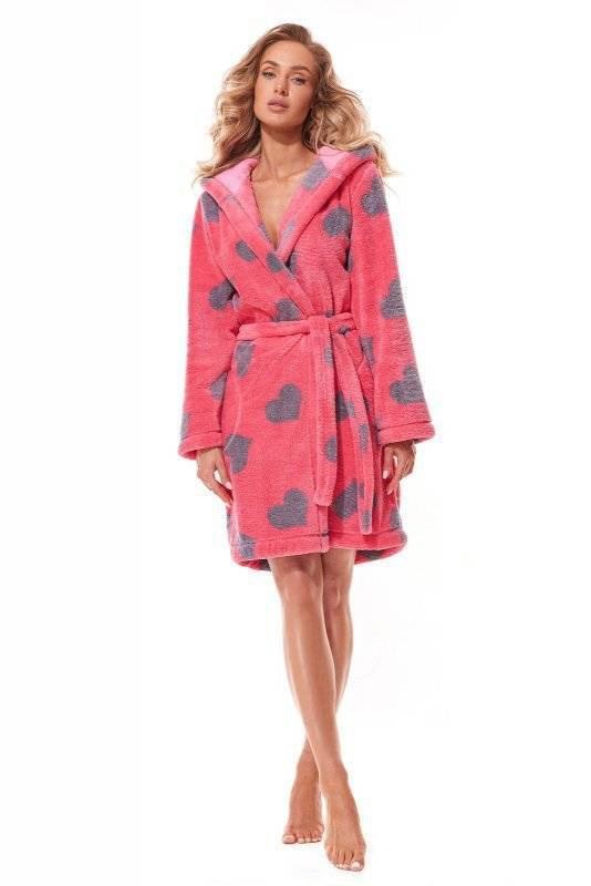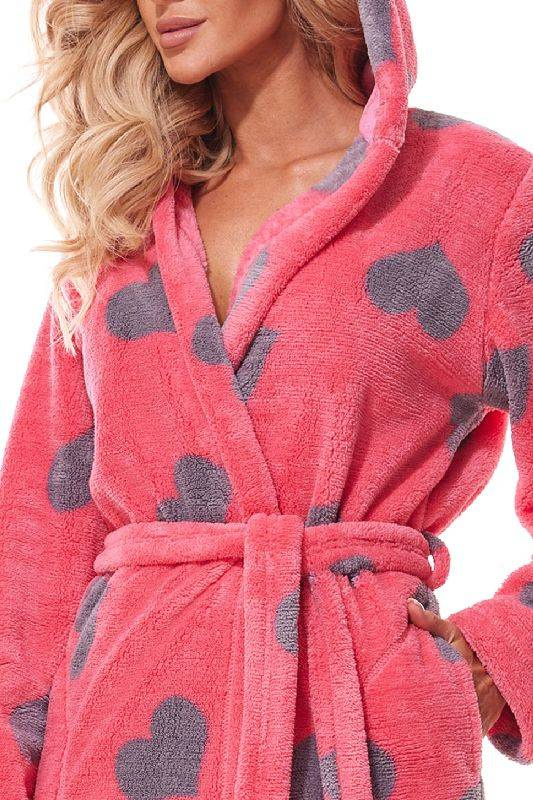 - Ciepły krótki szlafrok damski z kapturem, w uroczy wzorek z serduszek. Szlafrok przed kolano