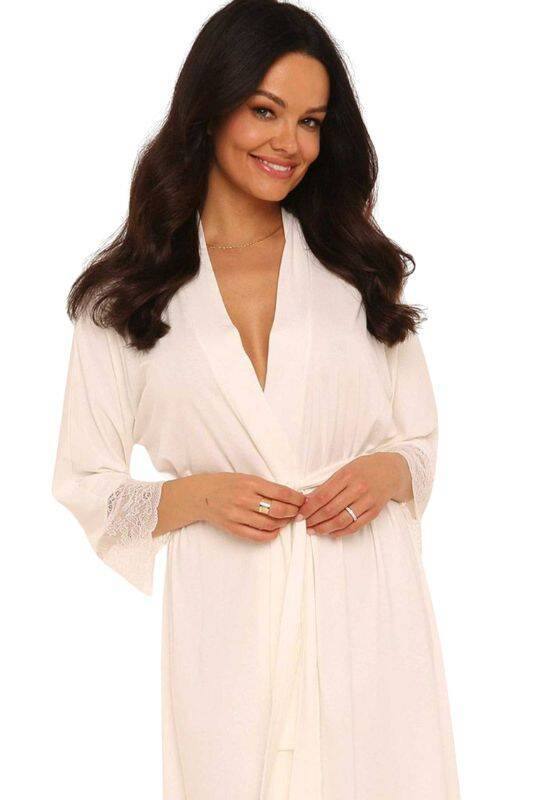 Elegancki krótki szlafrok De Lafense 342. Szlafrok wykonany z przyjemnej dla ciała wiskozy. Wiązany w pasie, rękaw 7/8, wykończony koronką. Uniwersalny i prosty krój, zadowoli każdą kobietę. Skład: wiskozy 94% i elastan 6 %.Elegancki krótki szlafrok ecru De Lafense Fanny 342 to doskonały wybór dla każdej kobiety, która pragnie czuć się komfortowo i stylowo w każdej chwili. Wykonany z wysokiej jakości wiskozy, ten delikatny szlafrok otuli Cię przyjemną miękkością, zapewniając jednocześnie niezwykły komfort noszenia.