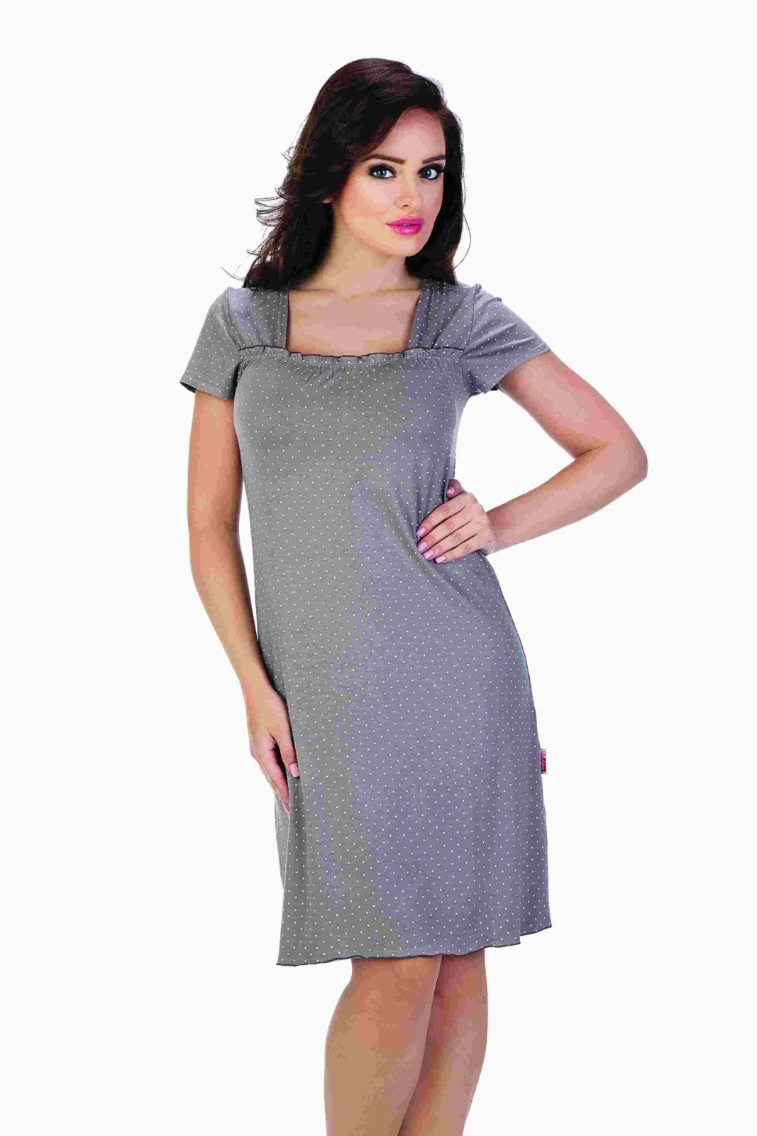 Koszula występuje w kolorze szarym, z delikatnymi kropkami, co nadaje jej lekkości i elegancji. Kropki oraz groszki wzbogacają model, tworząc efektowny i modny wygląd. Okrągły dekolt dodaje kobiecości, a krótkie rękawy sprawiają, że koszula ta jest doskonałym wyborem na cieplejsze noce.