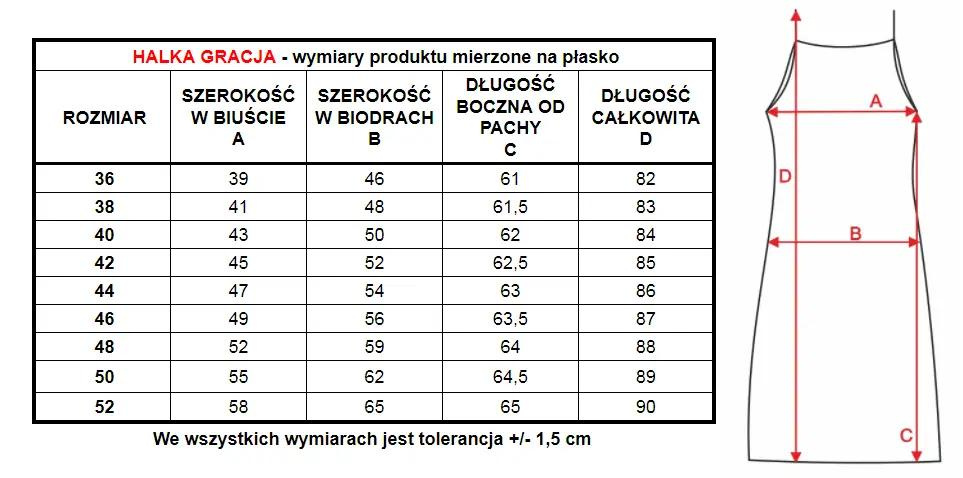 Halka Gracja charakteryzuje się okrągłym dekoltem oraz krótkim fasonem, co czyni ją idealnym dolem pod sukienkę lub spódnicę. Dzięki swojej uniwersalności sprawdzi się również jako element domowej garderoby lub bielizna nocna. Oferuje modny styl w połączeniu z funkcjonalnością.
