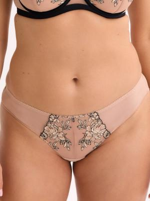 - Figi tanga Oksana w kolorze beżu to połączenie elegancji i lekkości. Przód zdobi delikatny czarno-beżowy haft, który przyciąga wzrok i nadaje całości wyrafinowanego charakteru.