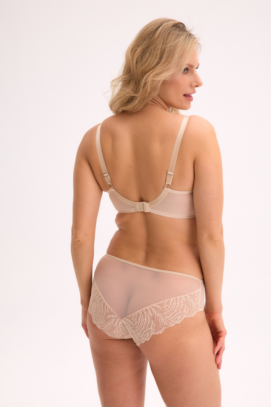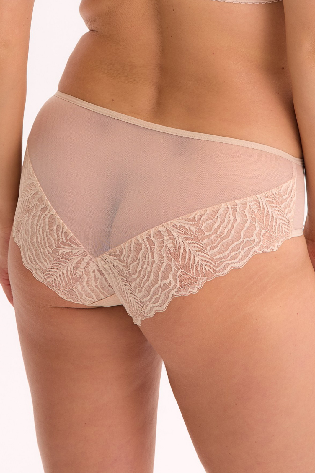 - Figi pełne Isla w kolorze beżowym łączą zmysłowość koronki z lekkością elastycznego tiulu w eleganckiej, ponadczasowej odsłonie. Koronka zdobi przód oraz nogawki z tyłu, nadając bieliźnie wyrafinowany wygląd.