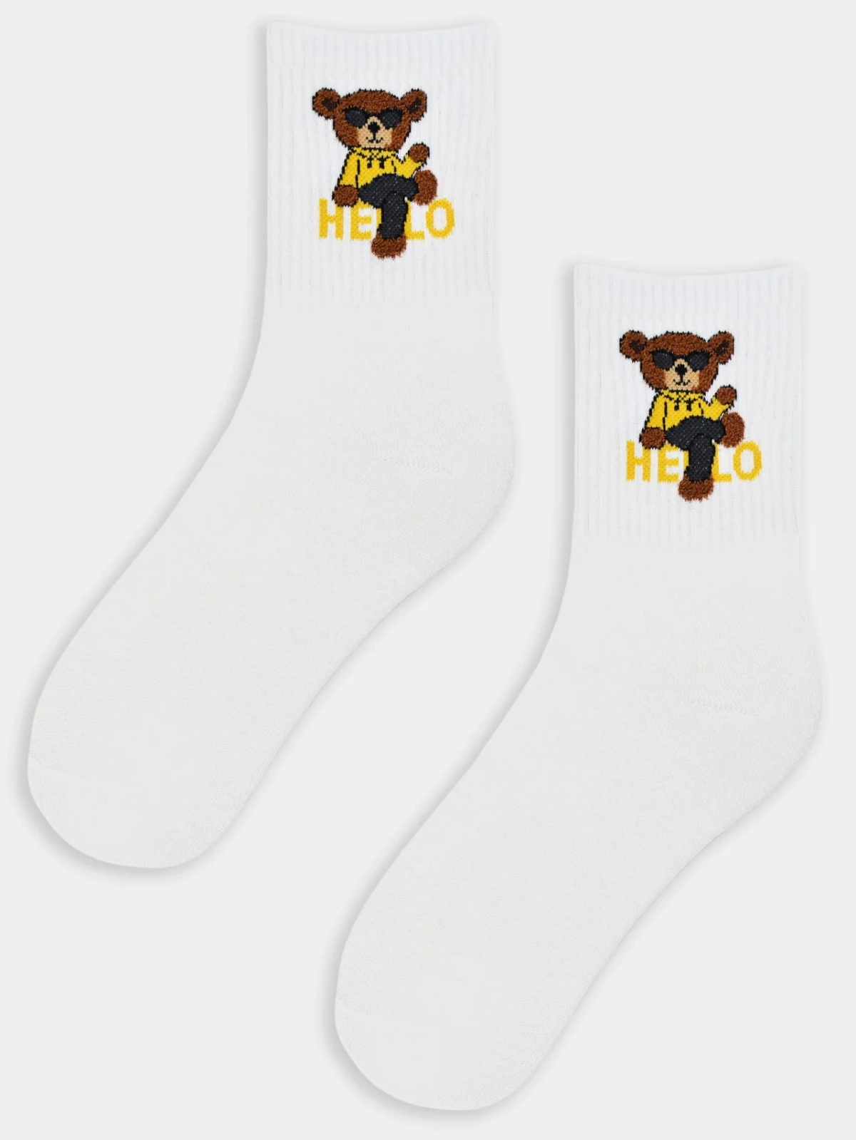 - Bawełniane skarpetki w białym kolorze z uroczym motywem śmiesznego misia. Ciepłe i wygodne, idealne na chłodne dni, doskonałe do relaksu w domu lub jako uroczy prezent!