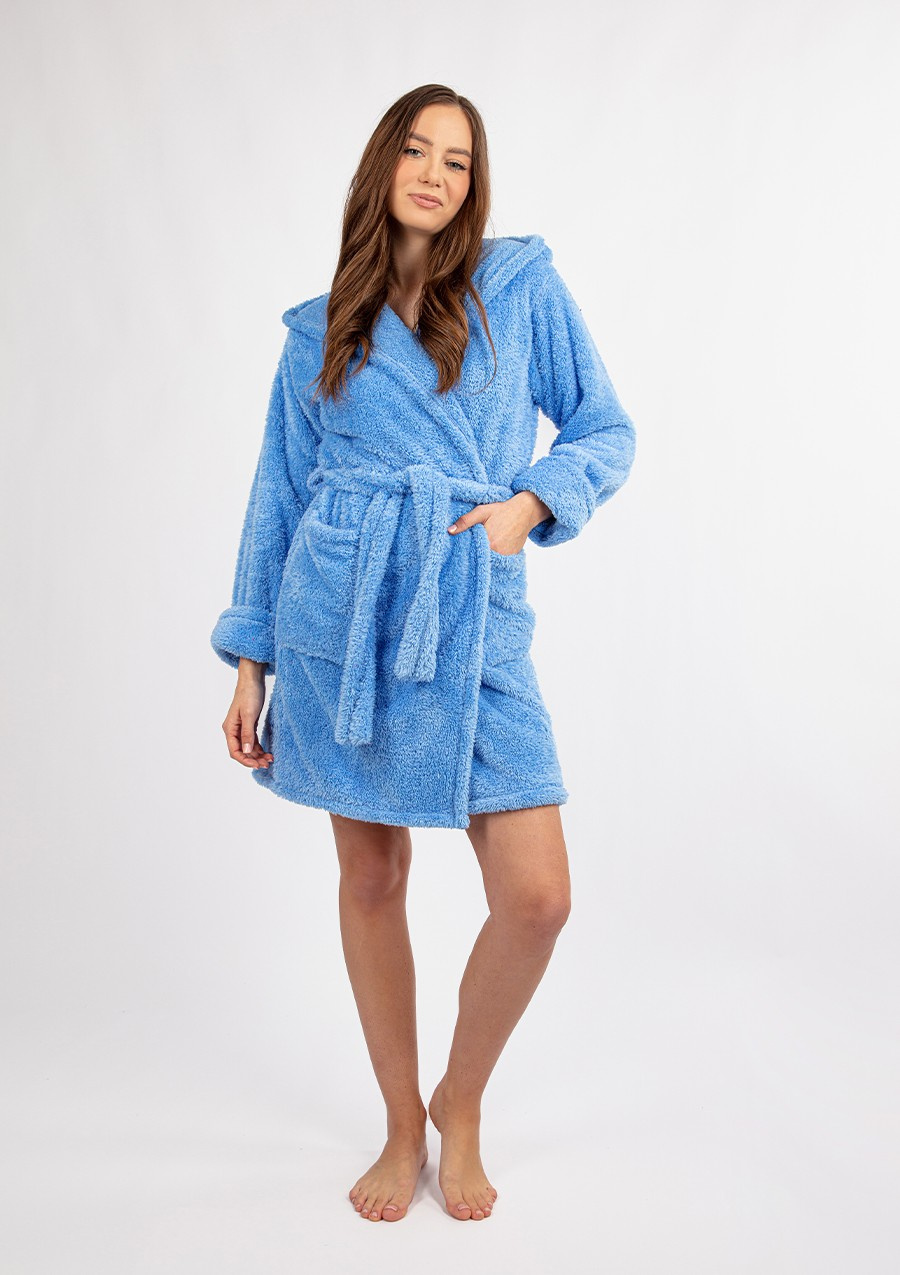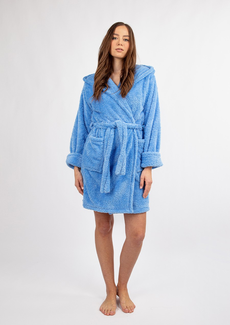 - Puchaty szlafroczek od marki Dkaren. Niesamowicie miękki i delikatny w dotyku. Przyjazny dla skóry. Posiada dwie pokaźne kieszenie oraz kaptur. Dostępny w wielu wariantach kolorystycznych.