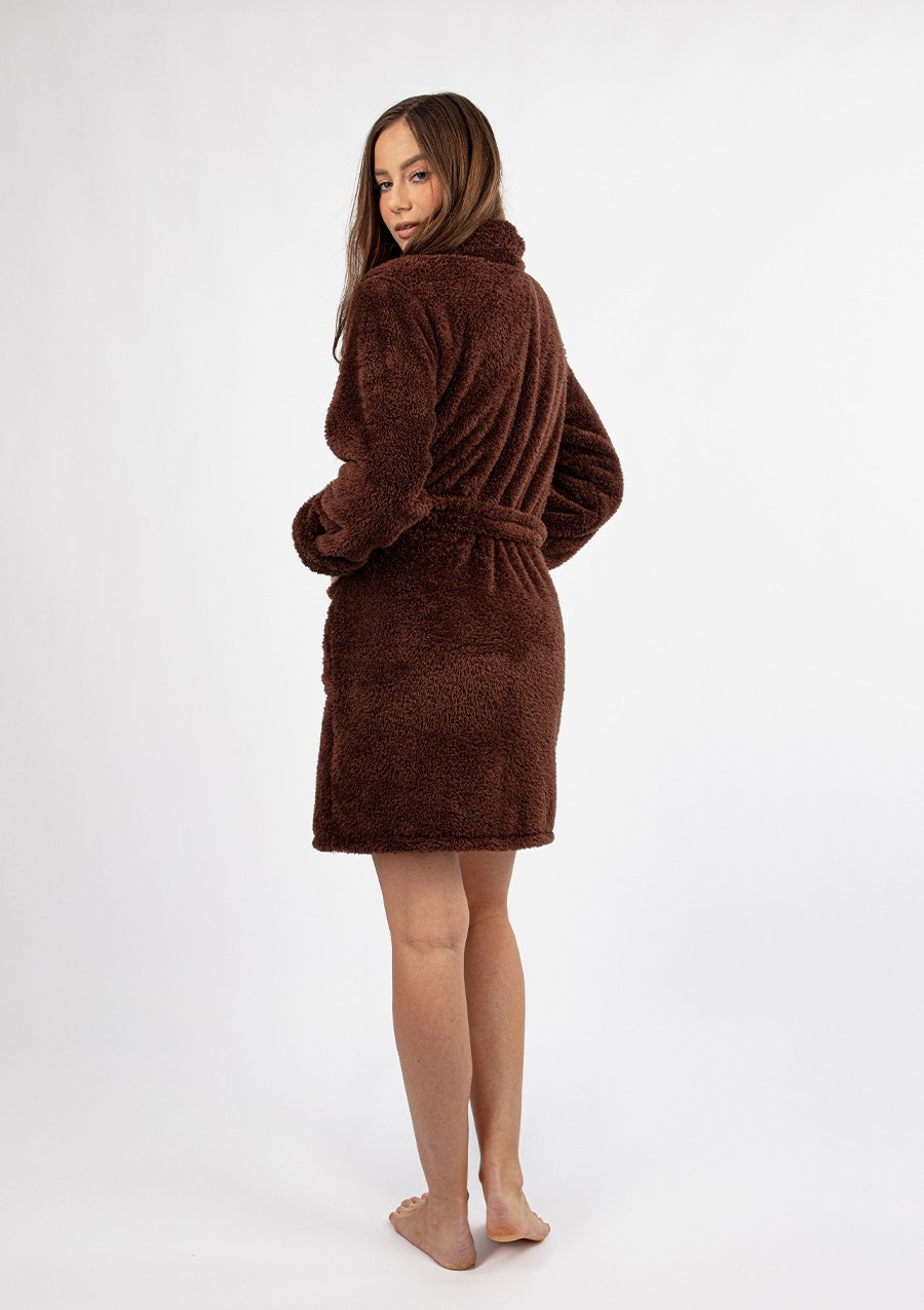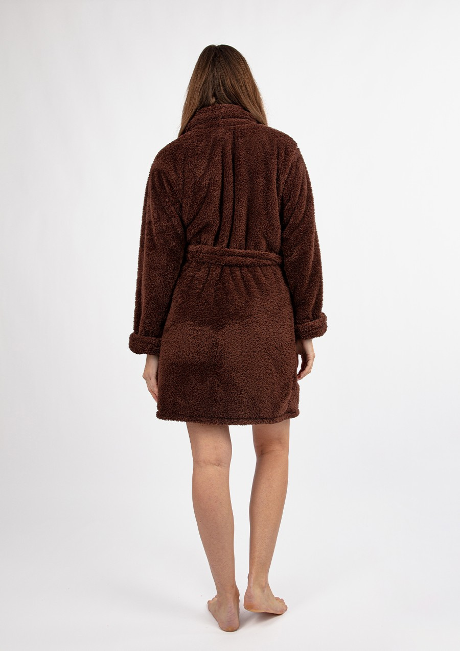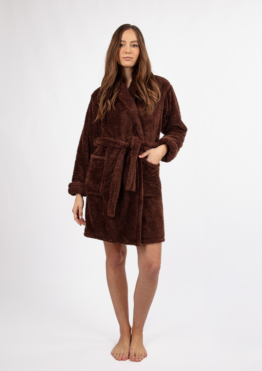 PODOMKA Z KOŁNIERZEM USZYTA Z NIEZWYKLE MIĘKKIEGO MATERIAŁU BARDZO DOBREJ JAKOŚCI. PO BOKACH DWIE KIESZENIE. RĘKAWY Z MANKIETAMI. DO SZLAFROKA JEST RÓWNIEŻ PASEK. DŁUGOŚĆ SZLAFROKA 90 CM. MATERIAŁ: DZIANINA RUNOWA TYPU LAMA. Jeżeli lubisz ciepłe i mięciutkie podomki, ale chcesz jednocześnie wyglądać atrakcyjnie, to na pewno przypadnie Ci do gustu nasz szlafrok Eliza. Gruby, pluszowy materiał z wysokiej jakości poliestru zapewni Ci ciepło, a pas w talii pozwoli na podkreślenie Twoich naturalnych atutów. Szeroki dekolt pozwoli Ci na zachowanie proporcji sylwetki. Oferujemy przyjemne w dotyku i wykonane z grubej tkaniny Podomki Eliza w wielu zupełnie różnych kolorach – wesołych różach i zieleniach, a także klasycznej czerni, granatu oraz ecru. Długość całkowita szlafroku wynosi 90 centymetrów, a więc jest to optymalna długość, która będzie pasować niezależnie od wzrostu. Teraz możesz mieć wysokiej jakości szlafrok w zaskakująco niskiej cenie. Jak prać i prasować? Taki materiał najlepiej prać ręcznie w temperaturze 30°C. Proszę nie chlorować, nie czyścić chemicznie i nie wirować. Prasować w temperaturze 110°C. Owiń się w czysty luksus dzięki naszemu czerwonemu szlafrokowi. Wykonany z najlepszej 100% bawełny, szlafrok ten jest idealny na leniwe dni spędzane w domu. Jest miękki i przytulny, dzięki czemu zapewni Ci ciepło i wygodę przez cały dzień. Zrelaksuj się i poświęć trochę czasu sobie dzięki naszemu luksusowemu czerwonemu szlafrokowi. Skład surowcowy: 100% poliester.Podomka ELIZA - Puch Czekolada od Dkaren