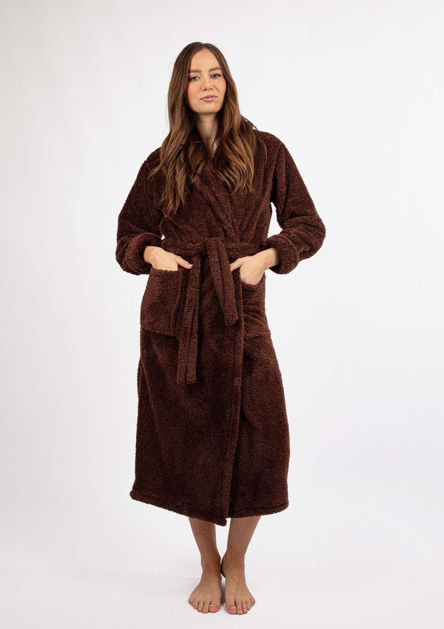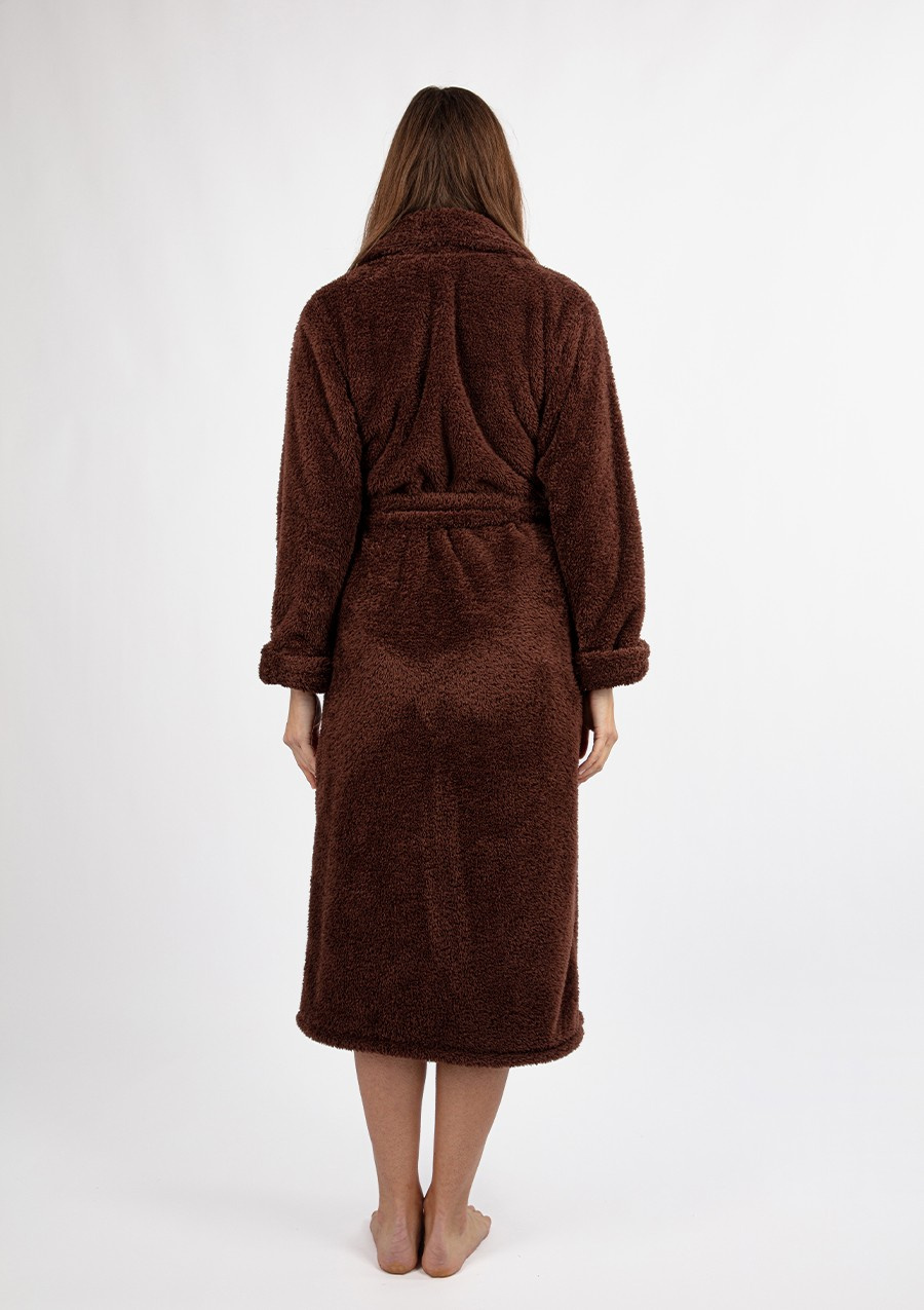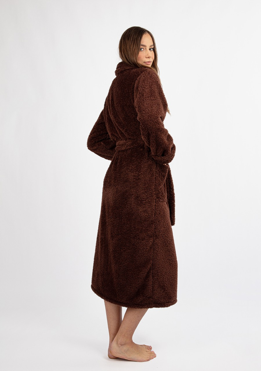 - Unikalny design – głęboki odcień brązu czekoladowego nadaje elegancji oraz sprawia, że szlafrok wpisuje się w najnowsze trendy modowe.