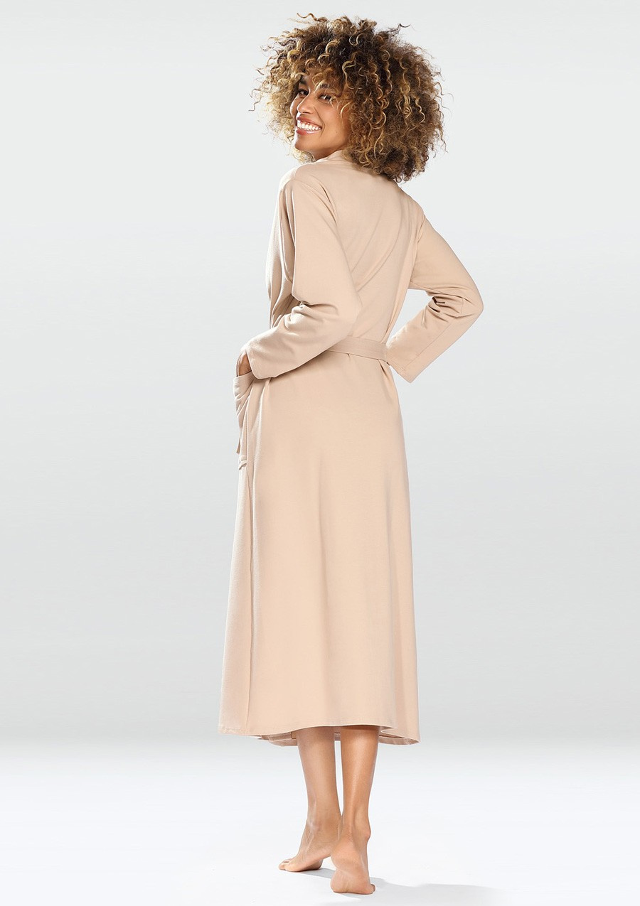 Szlafrok MELISSA to must-have w każdej garderobie. Niezależnie od tego, czy spędzasz relaksujący dzień w domu, czy przygotowujesz się na przyjęcie lub odprężający wieczór po pracy, ten beżowy szlafrok będzie doskonałym wyborem. Jego gładka faktura i elegancki krój sprawiają, że poczujesz się atrakcyjnie i pewnie w każdej sytuacji.