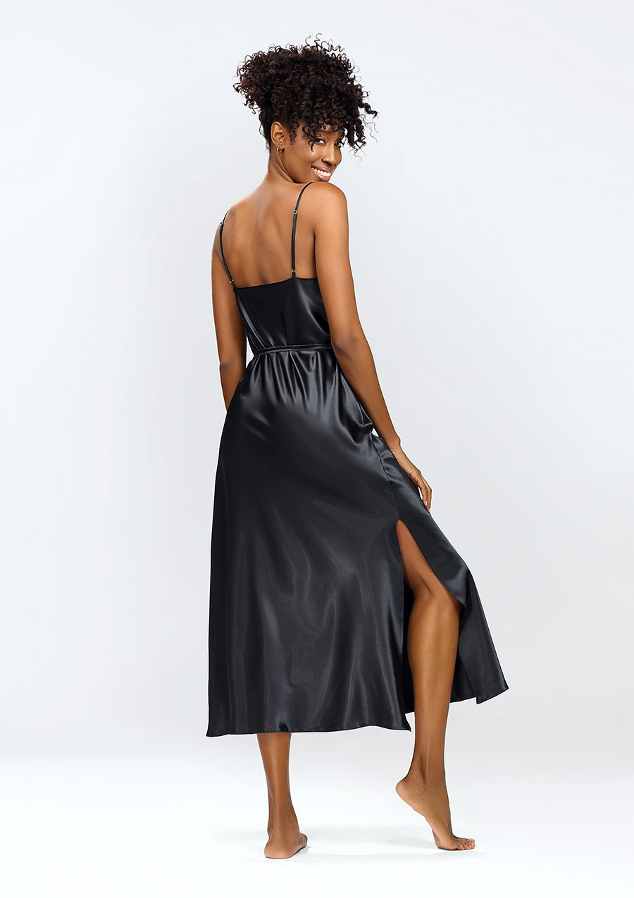 Halka Ife to satynowa halka o długim kroju. Delikatny satynowy pasek pozwala dopasować krój do naszych kształtów. Koronkowe wykończenie nadaje jej seksowności i zmysłowości. Halka Ife posiada wycięcia na bokach, dzięki czemu jest wygodna i komfortowa. Jest to klasyczna propozycja koszulki nocnej. Jej uniwersalny i stonowany krój jest często wybierany na prezent. Jak prać i prasować? Taki materiał najlepiej prać ręcznie w temperaturze 30°C. Proszę nie chlorować, nie czyścić chemicznie i nie wirować. Prasować w temperaturze 110°C. Skład surowcowy: 100% poliesterOdkryj niezrównany komfort i elegancję z halką Ife marki Dkaren! Wykonana z najwyższej jakości satyny w głębokim, zmysłowym kolorze czarnym, halka Ife to idealny wybór dla każdej kobiety, która pragnie poczuć się wyjątkowo.