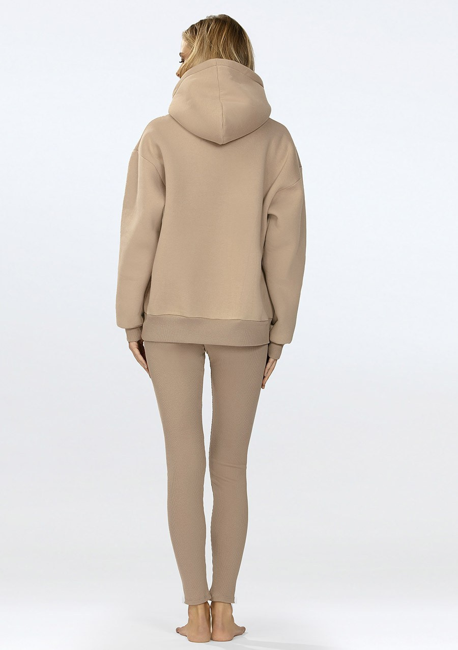 Kolor cappuccino z delikatnymi prążkami nadaje zestawowi elegancki i nowoczesny charakter. Luźny krój sprawia, że ubranie nie krępuje ruchów, a długie rękawy i nogawki idealnie sprawdzą się w chłodniejsze dni. Dzięki temu możesz cieszyć się stylowym wyglądem bez rezygnacji z wygody.