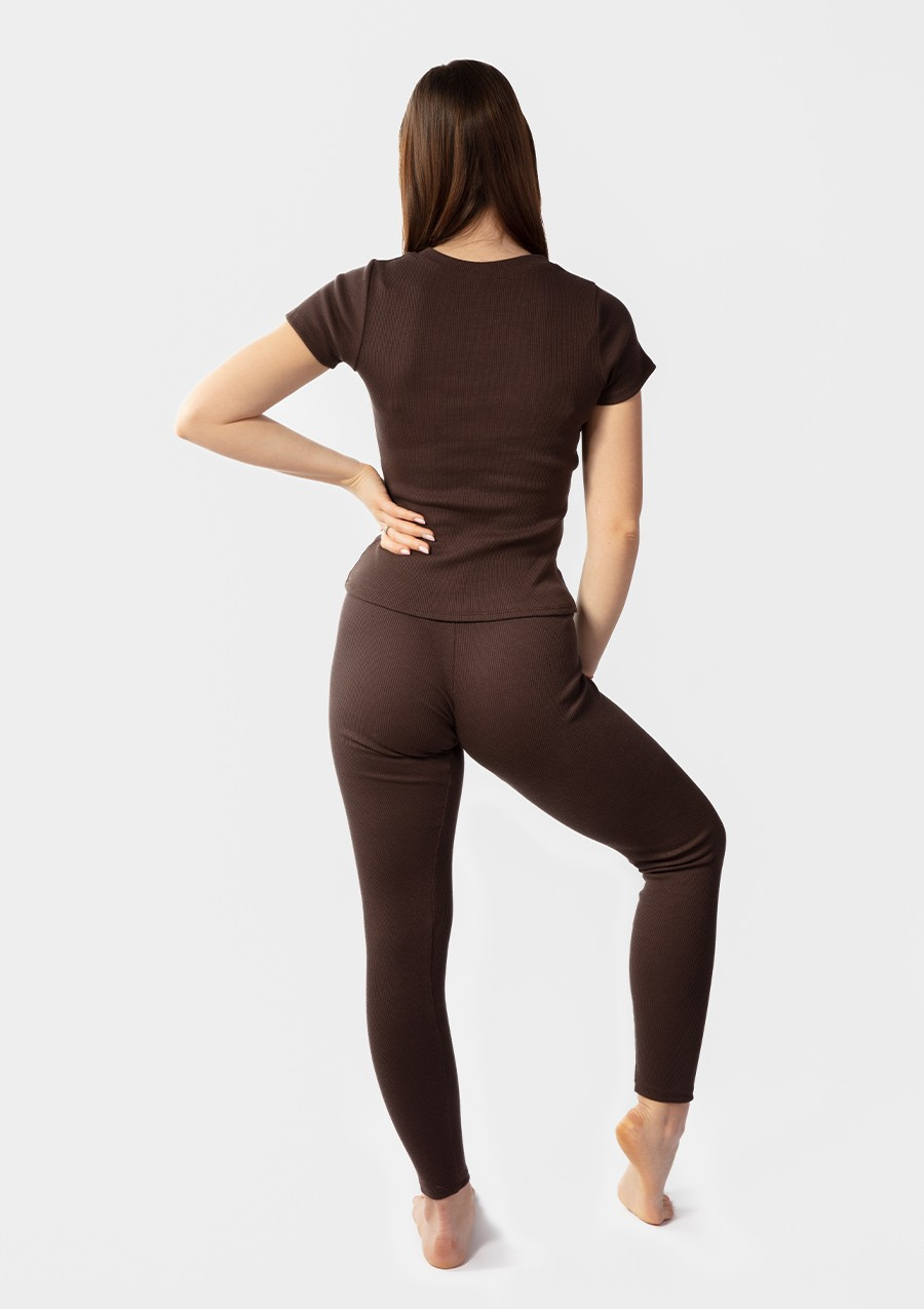 Komplet Halima wyróżnia się gładką fakturą oraz eleganckim dekoltem okrągłym. Spodnie długie idealnie dopasowują się do sylwetki, podkreślając kobiece kształty. Czekoladowy odcień nadaje całości nie tylko klasy, ale i sprawia, że zestaw jest ponadczasowy. Dzięki temu, możesz go łączyć z różnymi dodatkami, tworząc unikalne stylizacje na każdą okazję.