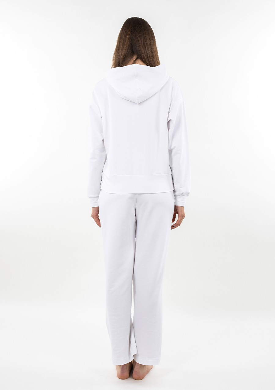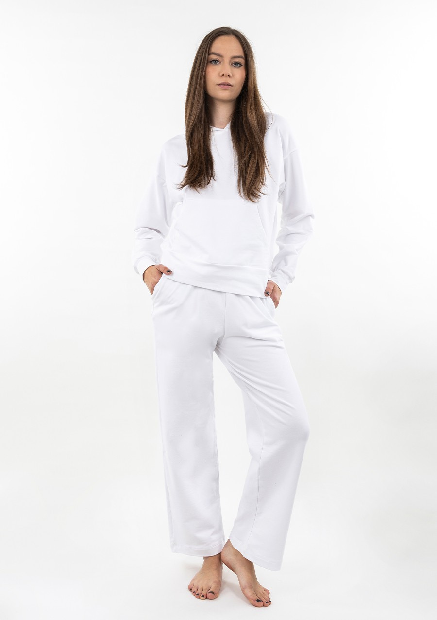 Komplet sportowy bluza z kapturem i "kangurką" oraz szerokie spodnie Dk-k-b8 - biały bawełna - Dkaren