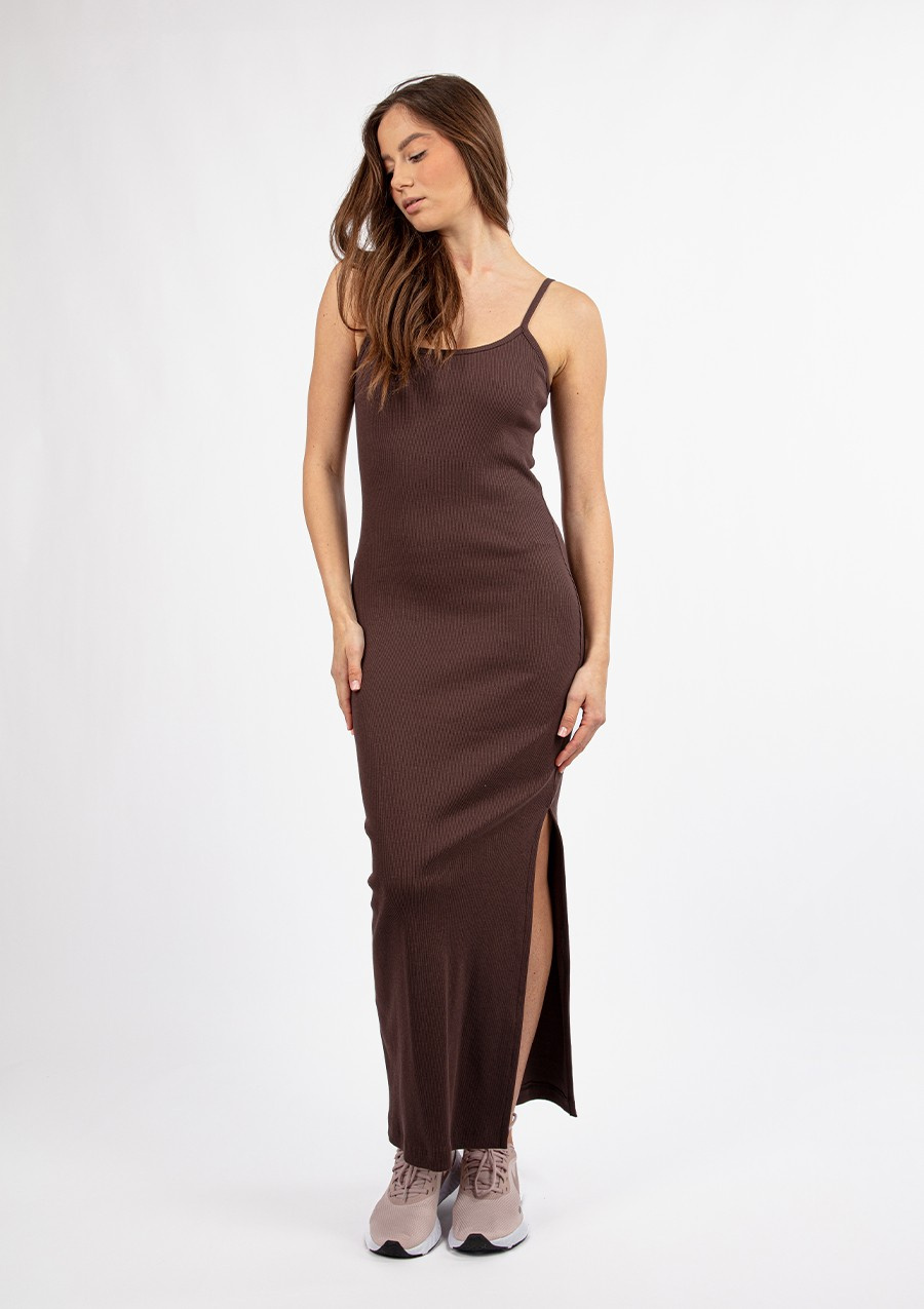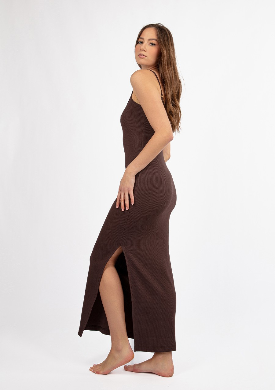 Sukienka długa w prążek z dużym wycięciem na bokuOdkryj nowy poziom elegancji i seksapilu z naszą długą sukienką w prążek, zaprojektowaną z myślą o podkreśleniu kobiecych kształtów. Ten model to esencja zmysłowego stylu, idealna na wyjątkowe okazje, gdy chcesz zrobić niezapomniane wrażenie.Zmysłowy i kobiecy krójSukienka wyróżnia się dużym wycięciem na boku, które subtelnie eksponuje nogę, dodając całej stylizacji seksapilu. Delikatne ramiączka i dopasowany krój idealnie podkreślają sylwetkę, podążając za każdym ruchem i podkreślając kobiece atuty.Gruby prążkowany materiałWykonana z wysokiej jakości prążkowanego materiału, sukienka jest nie tylko elegancka, ale również komfortowa. Prążkowana faktura dodaje jej subtelności, a jednocześnie podkreśla figury, tworząc efekt wysmuklający. Prążek jest gruby dzięki czemu nie ma obawy że materiał będzie prześwitywał.Sukienka w prążek kolorySukienka w prążek od Dkaren dostępna jest w wielu kolorach. Od klasycznych takich jak czerwony, czarny czy ecru po bardziej wyraziste jak fiolet, zieleń czy fuksja.Elegancja i wygodaDzięki swojej długości i wyrafinowanemu krojowi, ta sukienka jest idealnym wyborem na wieczorne wyjścia, romantyczne kolacje czy inne wyjątkowe okazje. Jednocześnie jest na tyle wygodna, że będziesz czuła się w niej swobodnie przez cały wieczór. Z sukienką Dkaren w prążek stworzysz stylizację, która nie tylko przyciągnie spojrzenia, ale też pozwoli Ci poczuć się pewnie i kobieco w każdej sytuacji. Jak prać i prasować bawełnę? Materiał wiskozę prać z procesem ochronnym w temperaturze nie wyższej niż 30°C / 40°C. Prasować w temperaturze nie wyższej niż 150°C. Nie czyścić chemicznie i nie suszyć w suszarce bębnowej. Pamiętaj, że najlepszym sposobem jest suszenie na wieszaku.Materiał: BawełnaSkład surowcowy: 95 % bawełna, 5 % elastan.Odkryj wyjątkową dopasowaną sukienkę DK-K-P7 od Dkaren w pięknym kolorze czekolady! Ta stylowa sukienka, wykonana z wysokiej jakości bawełny prążkowanej, jest idealnym wyborem dla kobiet, które pragną połączyć komfort z elegancją i modnym wyglądem. Dzięki swojej prostocie i elegancji, z pewnością stanie się nieodłącznym elementem Twojej garderoby.