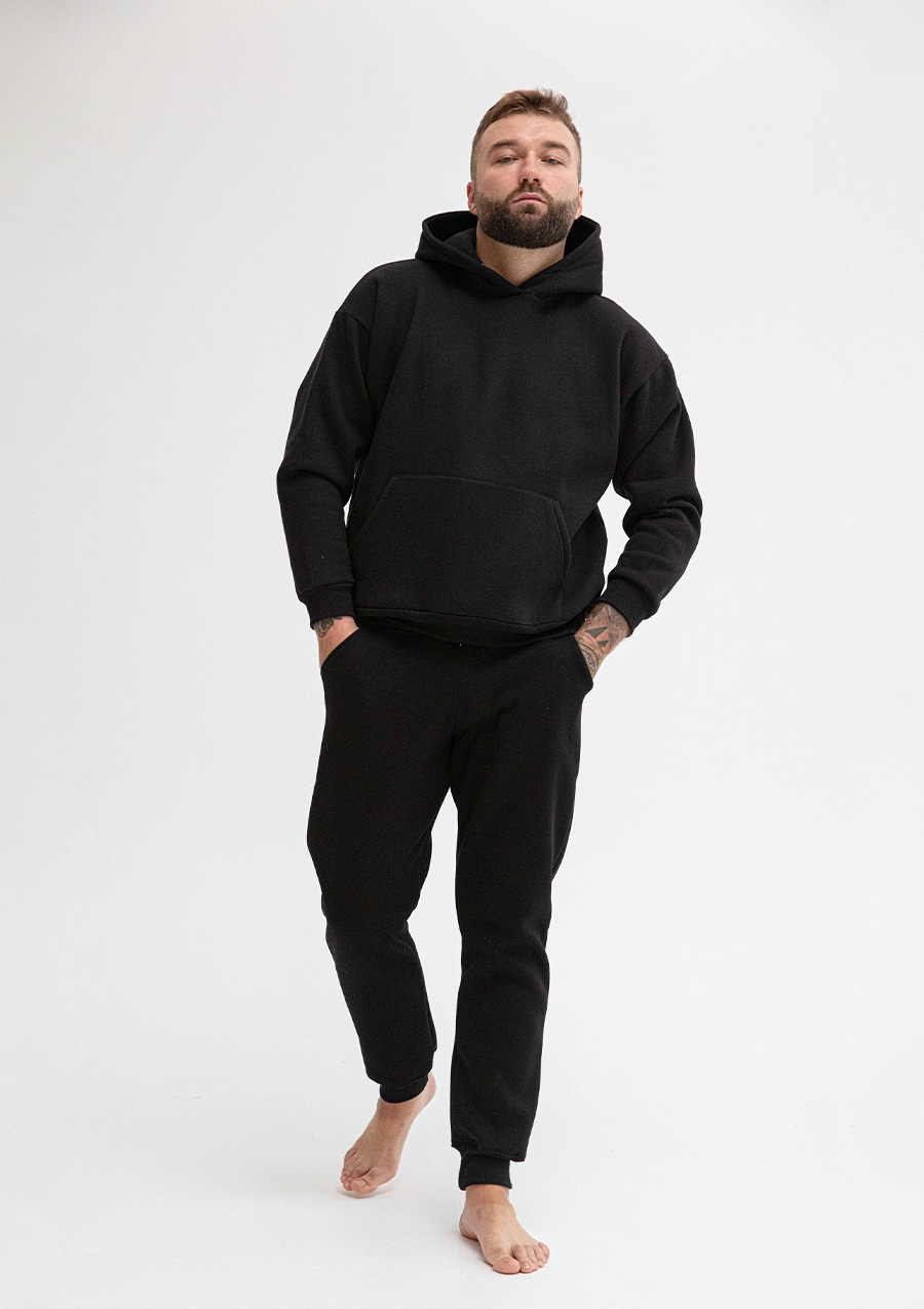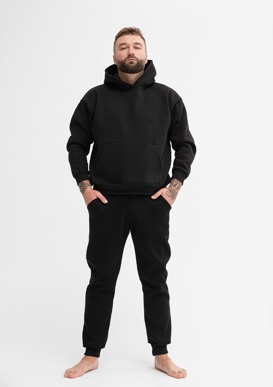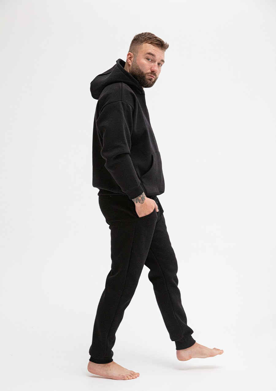 - Klasyczna męska bluza z kapturem i wygodne spodnie z kieszeniami i ściągaczami na nogawkach. Stylowy komplet uszyty z grubej, wysokogatunkowej bawełny