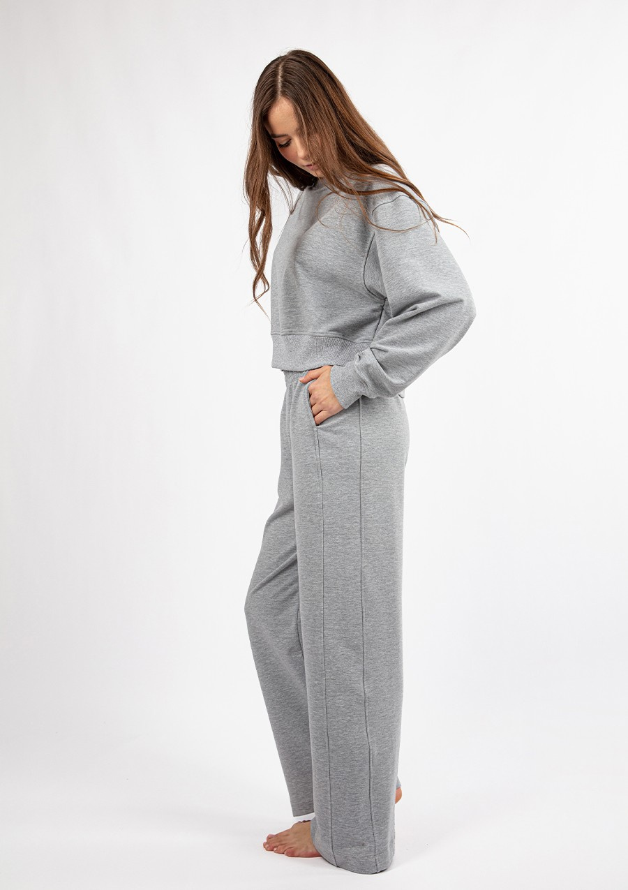 Gładka struktura materiału w połączeniu z jasnym szarym kolorem sprawia, że ten dres jest uniwersalnym elementem każdej garderoby, który z łatwością można zestawić z różnymi dodatkami.