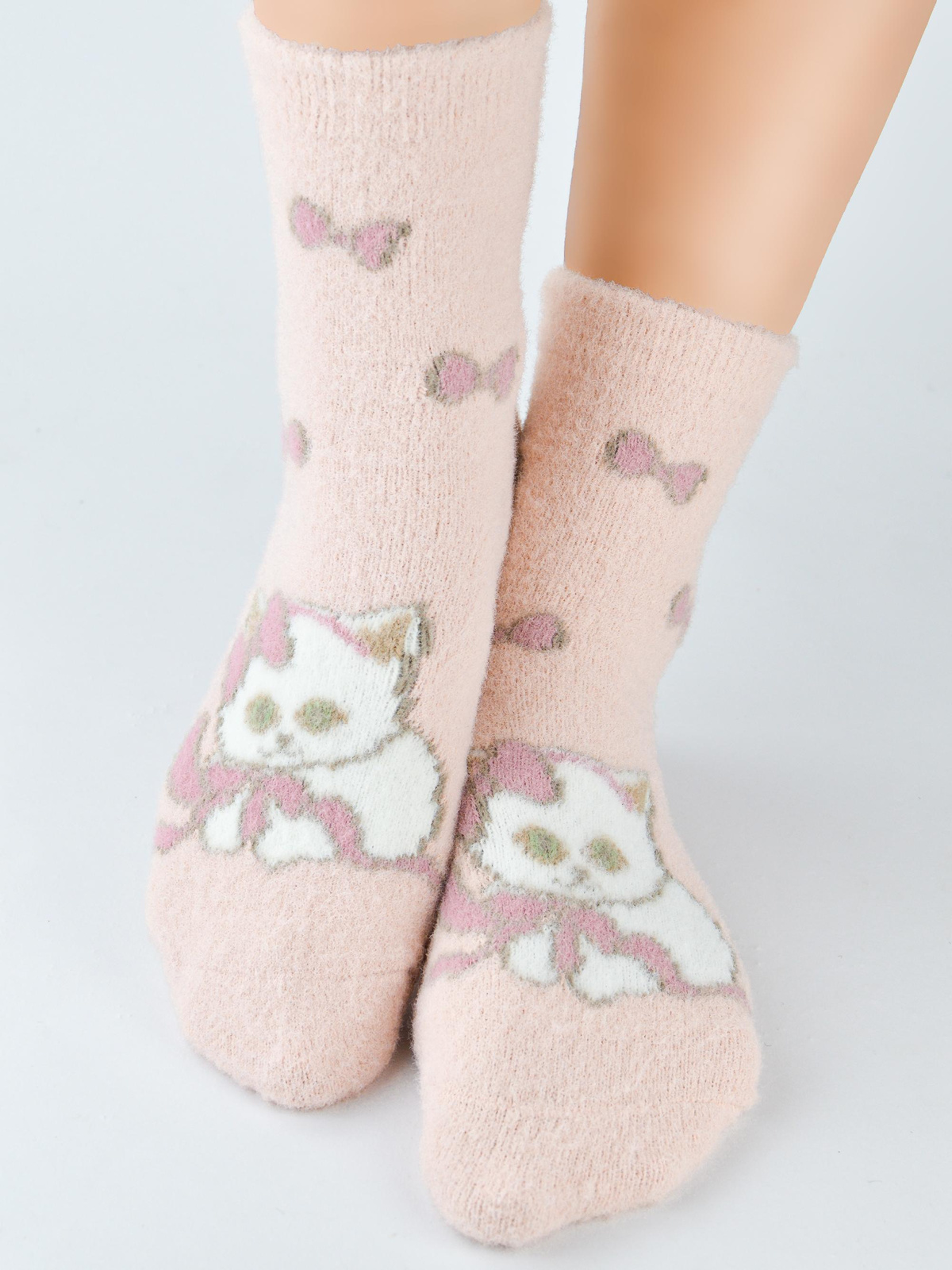 - Puchate, słodkie skarpetki z motywem kotka i kokardek. Cieplutkie urocze skarpetki damskie.