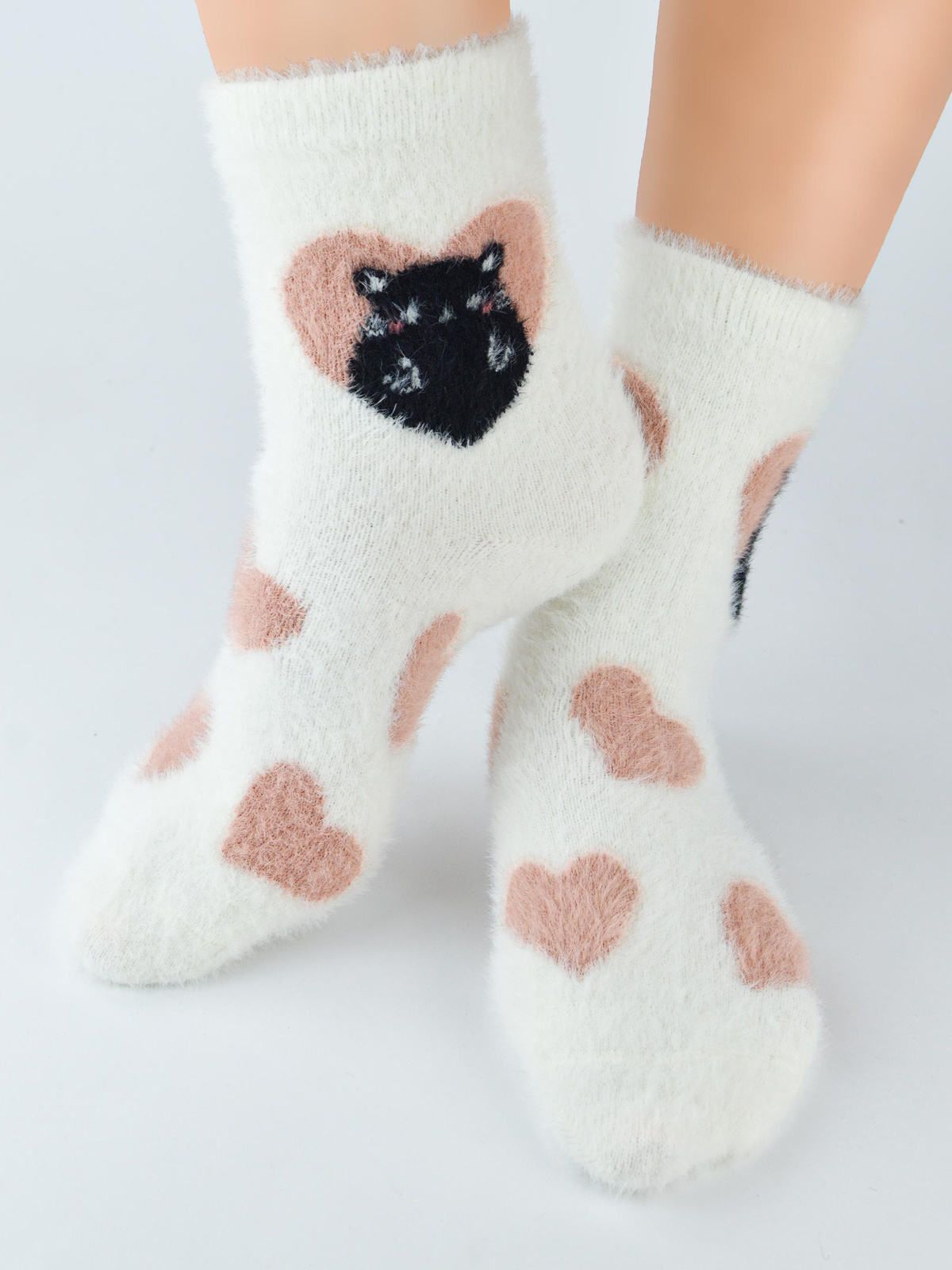 - Puchate, słodkie skarpetki z motywem czarnego kotka wśród serduszek. Cieplutkie urocze skarpetki damskie.