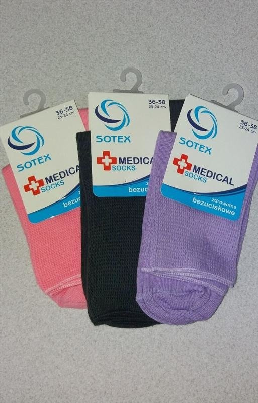 - Bezuciskowe damskie skarpetki, wykonane z bawełny z domieszką elastanu. Mają zastosowanie zdrowotne, zapewniają komfort noszenia. Szyte płaskim, miękkim szwem.