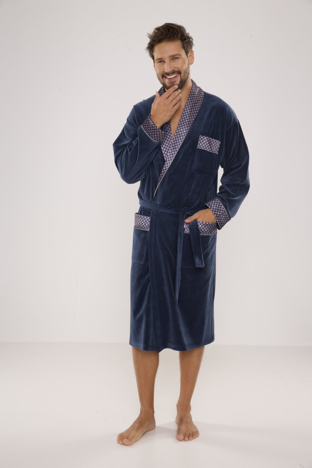 - Bawełniany szlafrok męski De Lafense 868. Długi, z szalowym kołnierzem, wiązany na pasek, z dwoma naszytymi kieszeniami i jedną mniejszą na wysokości klatki piersiowej. Mankiety, kołnierz i kieszenie wykończone wzorzystą satyną. Bardzo wygodny i elegancki