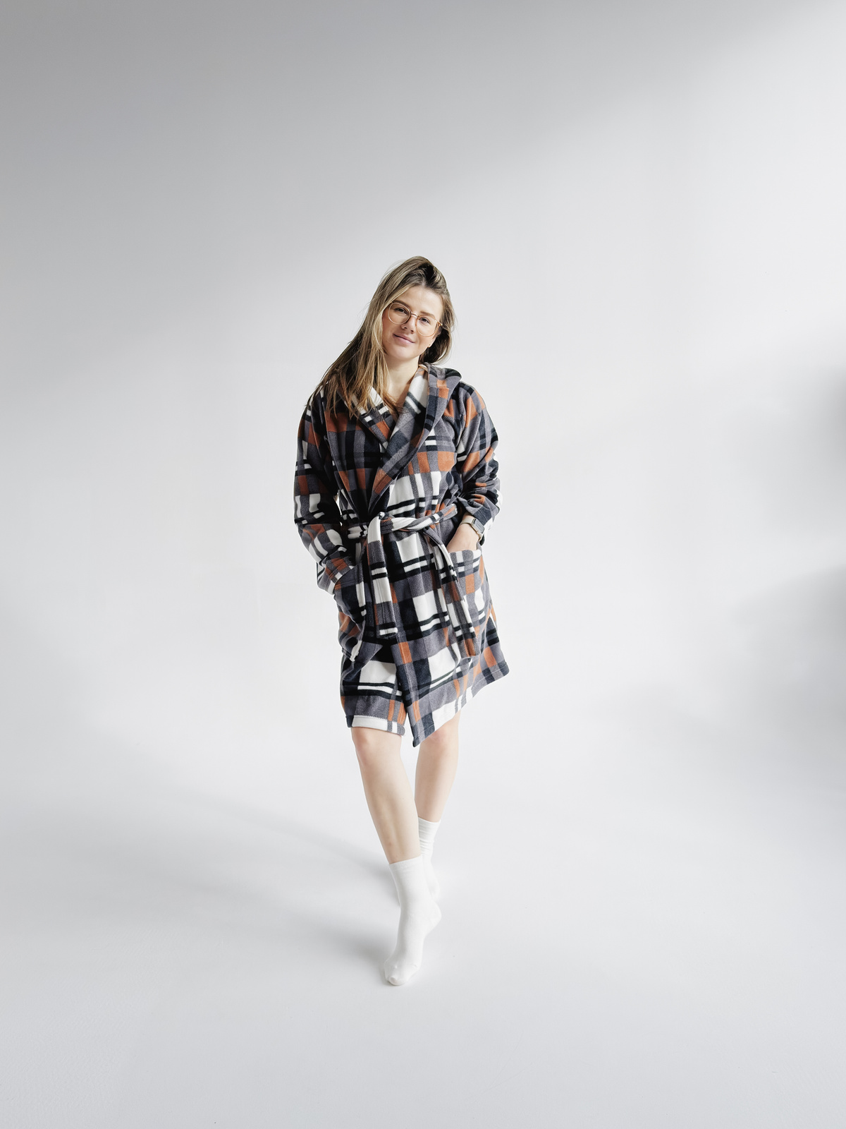 - Przytulny ciepły szlafrok/ kocyk z kapturem o długości do kolana, wiązany w pasie. Idealny na zimowe wieczory.